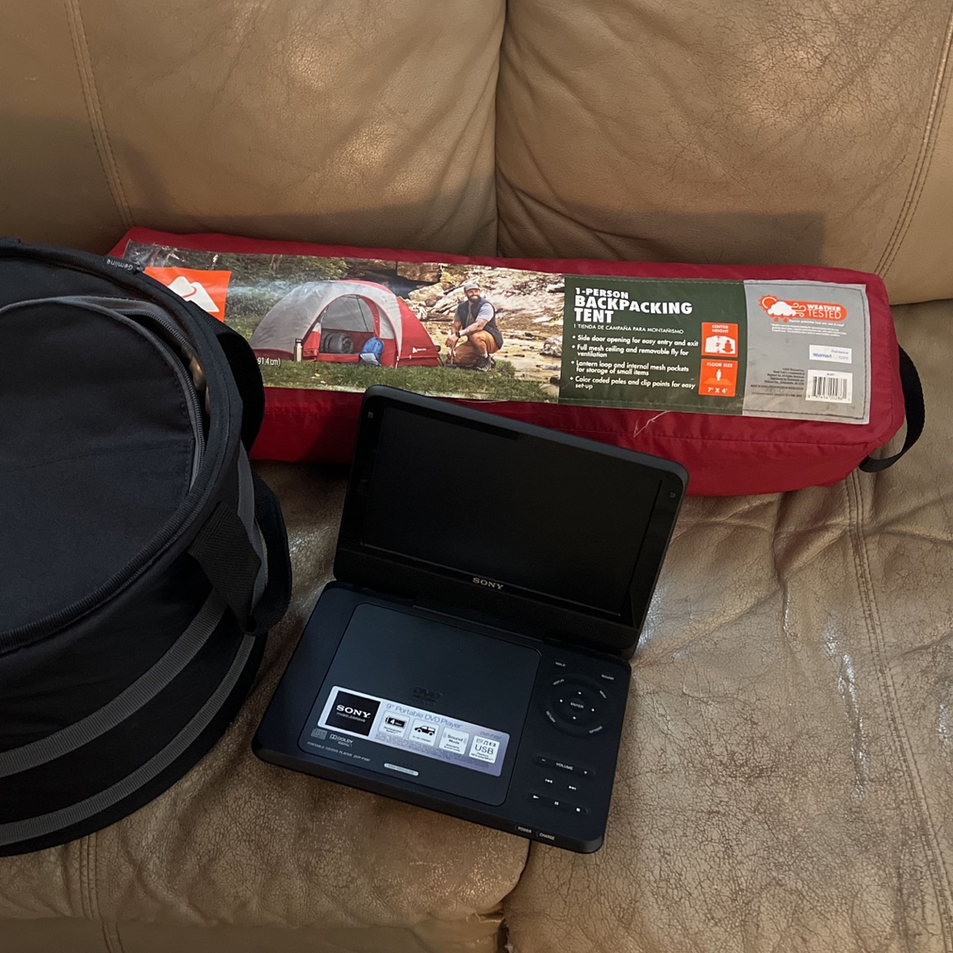 Back pack hiking 1 person tent with cooler and Sony dvd player. The dvd player is new but I can’t find the cord it’s a common cord which I have but as of now can’t find it.
