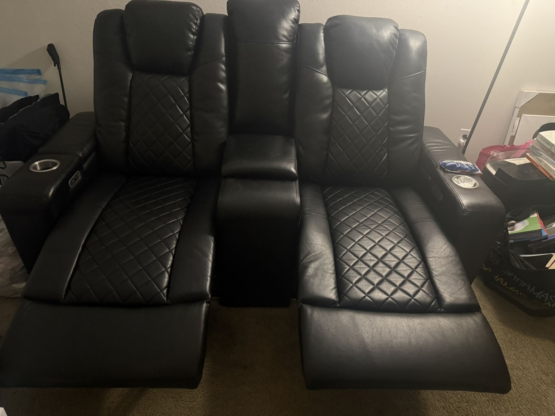 My parents are moving and they’re selling this 2 seater recliner leather couch with side buttons to recline 3 storage areas 1 on each side and 1 in the middle. Has charging outlets for phones, tablets, etc. Check pics for details. Paid over $900 purchased In February 2025.