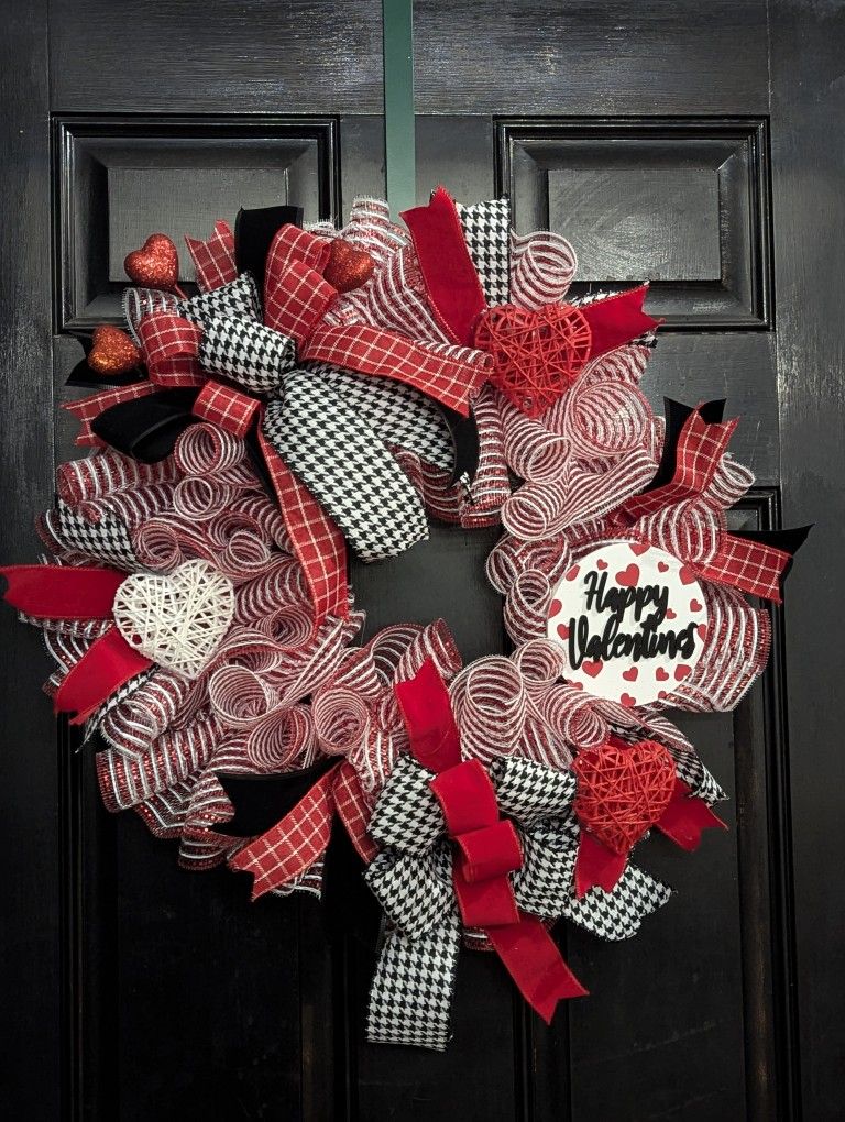 New, handmade valentine's day wreath done in a red, black and white color scheme. With coordinating ribbon and a wooden sign. Pickup in Hendersonville.