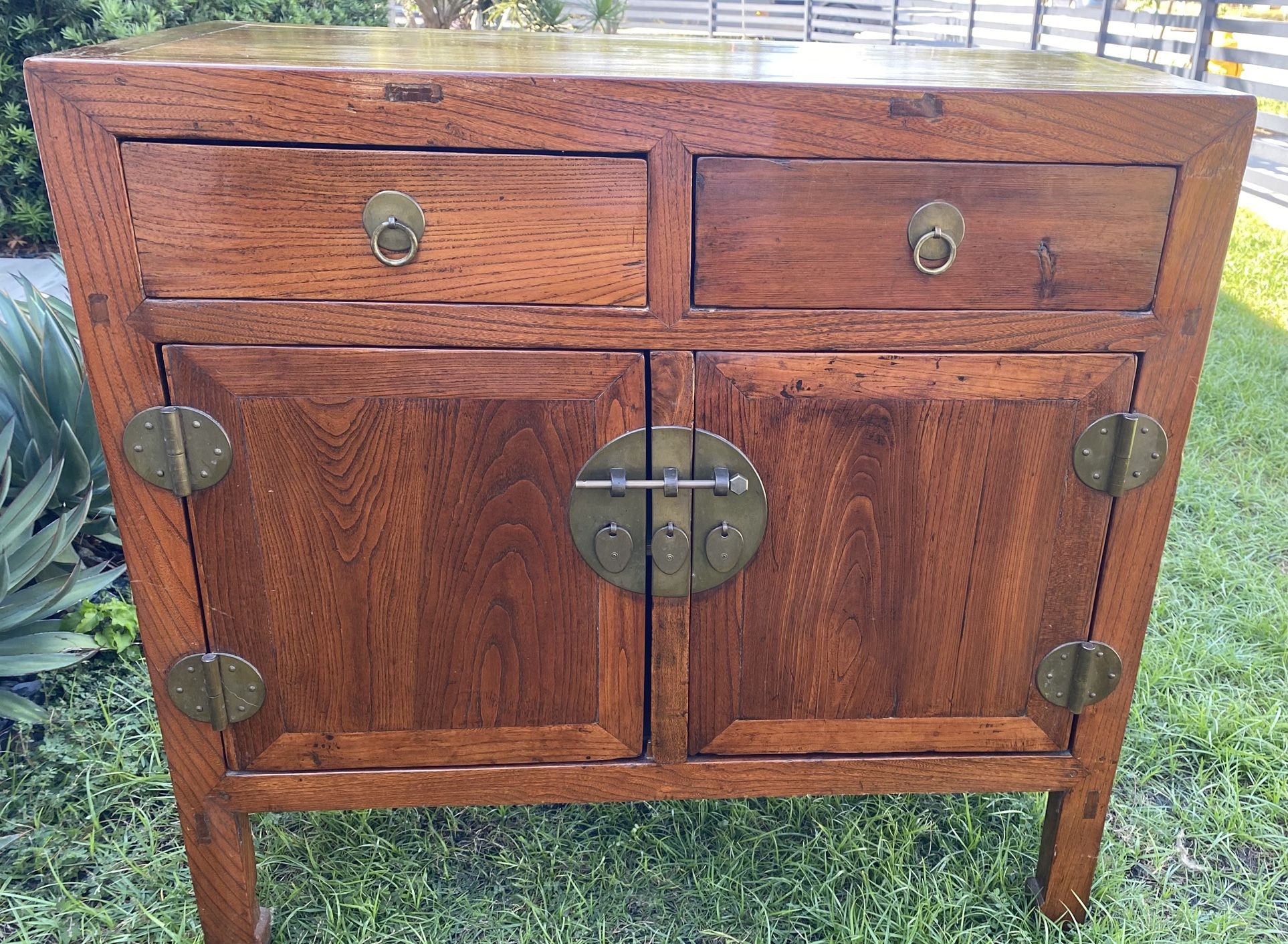Beautiful antique Asian wood credenza. This is an original piece, unfortunately I lost the paperwork but it is from the 1800’s. The workmanship is superb with mortise and tenon joinery. 2 drawers at the top and a shelf inside the cabinet. 37 1/4” tall 38 1/2” wide 17 3/4” deep