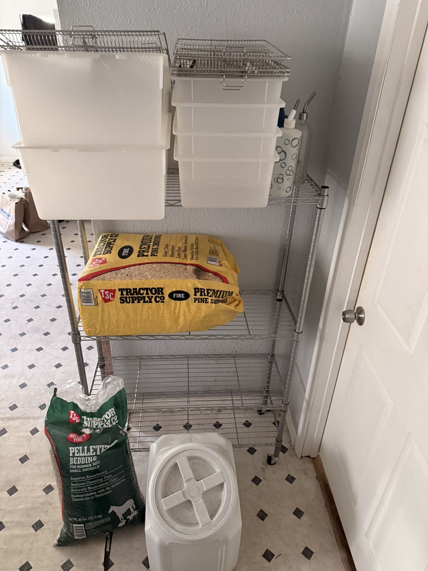 I have 2 bigger bins with lids. 4 smaller bins with lids wire with feeding area and water bottle holder. 4 water bottles with nipples. I bag of premium pine shavings and a tote of flacks not in picture it has lid as well. Bag of pellets for added absorption and a food storage container no trades cash only. And wire shelf. Located In Pueblo Co 81001