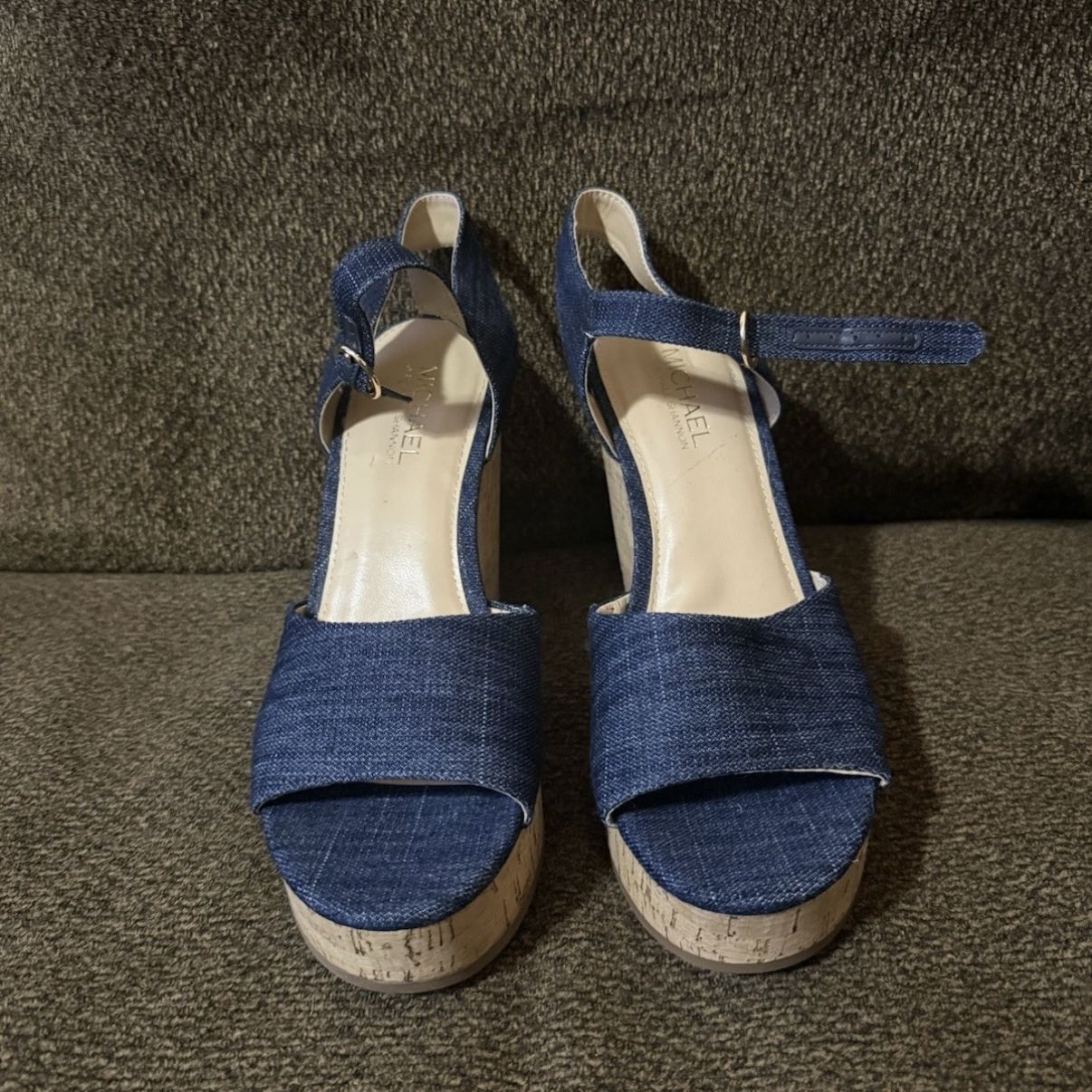 Stylish denim upper with cork platform wedge heel. Adjustable ankle strap with buckle closure. Comfortable elevated wedge perfect for spring and summer outfits. Details: • Brand: Michael by Michael Shannon • Women's Size: 11 • Denim upper • Cork platform wedge • Adjustable ankle strap • Open toe Condition: Never worn just tried on.