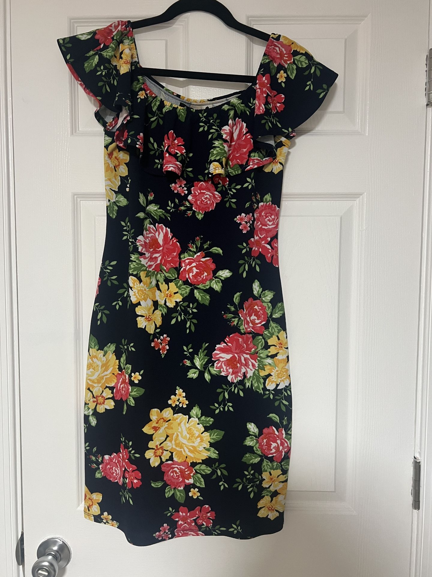 Beautiful floral dress in excellent condition Features a black base with red and yellow rose print, giving it a romantic and elegant look. No stains, rips, or flaws. Gently worn only once and well cared for. Details: • Off-the-shoulder / strapless-style neckline with ruffle detail • Fitted, bodycon silhouette • Above Knee-length • Lightweight and comfortable fabric • Pull-on style • Perfect for date night, brunch, summer parties or vacations