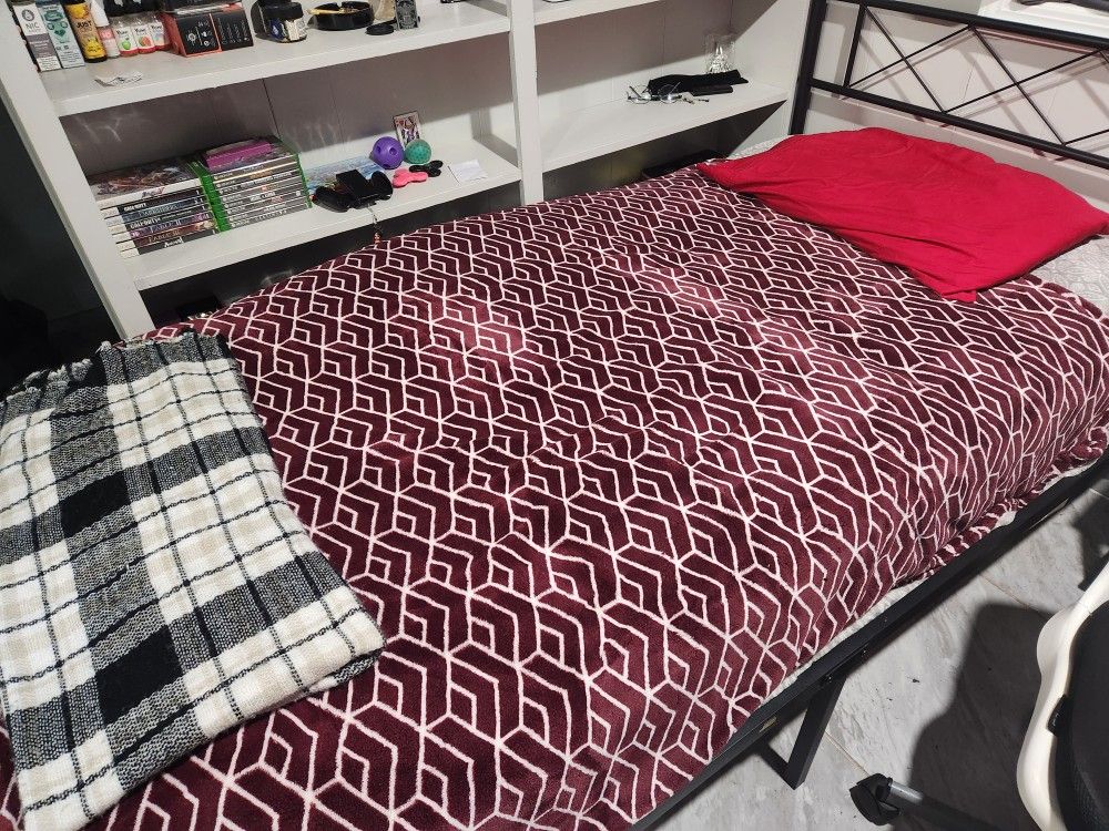 Used twin size mattress with twin frame. 2 screws missing, but still still holds up with no issues. Otherwise, all parts included. Screws in with Allen Wrench. Must take BOTH or NONE, NOT NEGOTIABLE! Cover photo shows the mattress and frame together with not included blankets and pillow. Pickup only.
