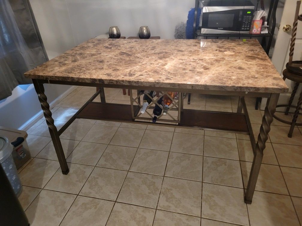 This strong, beautiful marble accent dining room table is for sale (just table). From a smoke-free and bug free clean home. It holds 7 bottles of champagne or wine and has plate holders underneath along with wood shelving. This is a large table with seating for 6-8. No chairs included. Will drop off for extra fees only in the DC metro area. Price is negotiable of the asking price.