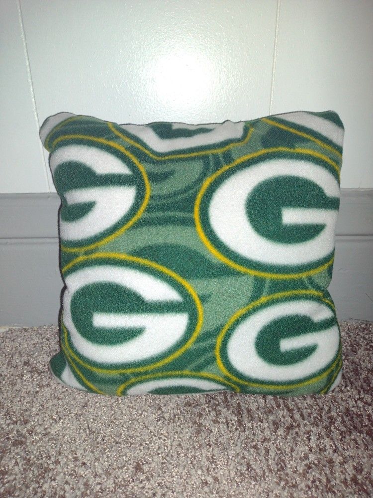 Handmade Green Bay Packers Pillow Both sides are made of soft fleece. One side has a Greenbay design, the other side is solid green. 12 inches by 12 inches
