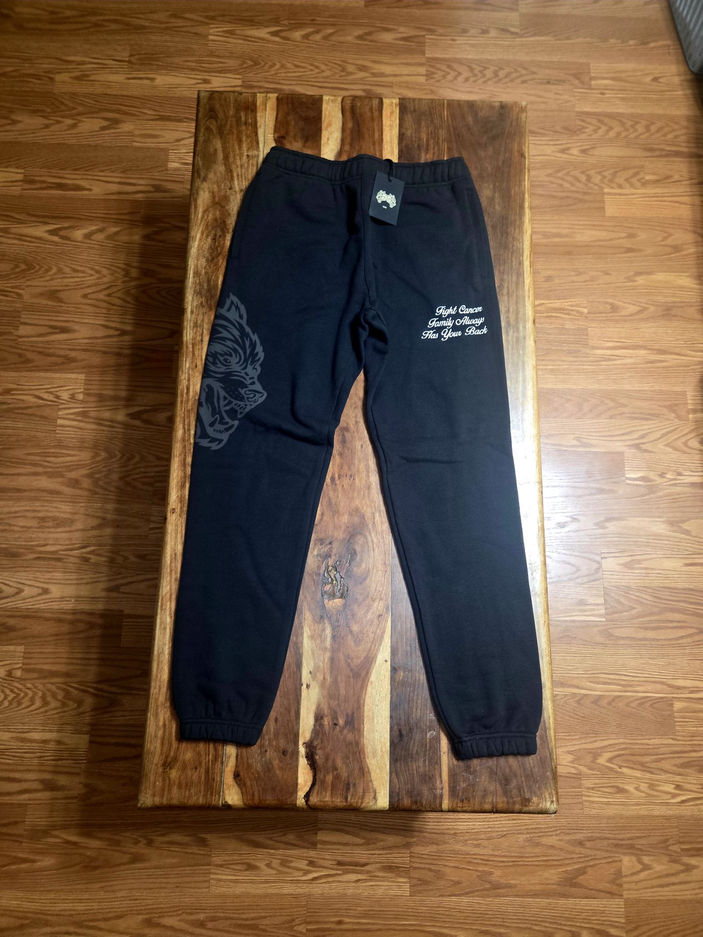 Women's Darc Sport SHE "FIGHT CANCER" Black Drawstring Sweatpants with Elastic waist and cuffed ankles. Striking Wolf graphic on right leg and a fight cancer script on the left. Perfect piece for anyone understanding of the struggles battling this horrible disease. #355 of 1000 ever made! Size Small and are Brand New with Tags!