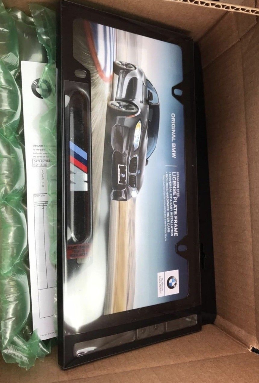 2 oem bmw license plate frames oem in original packaging black only selling cause I have some already ...80 bucks for both ....973....234.......2397