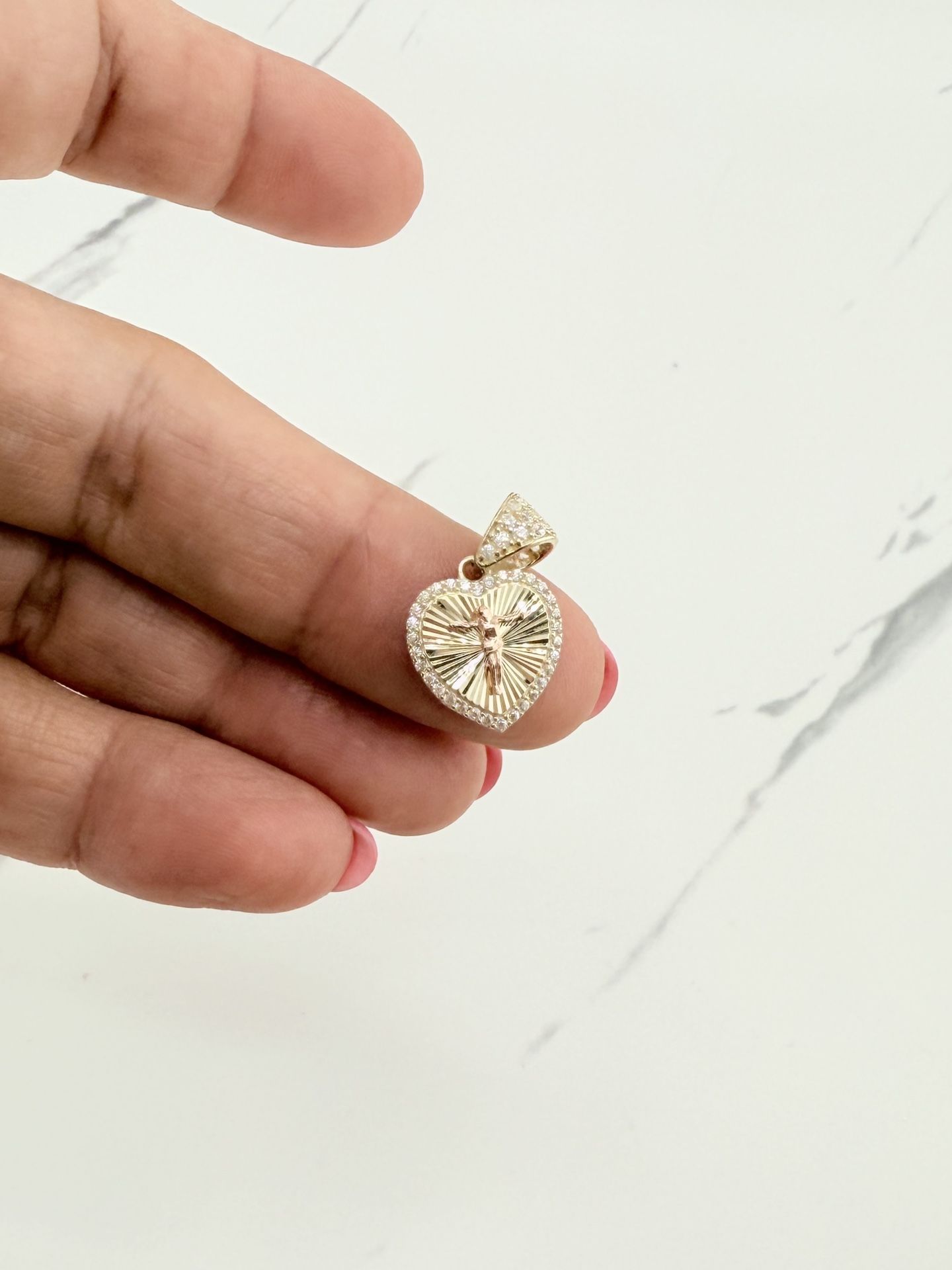 ❤️ 10k Gold pendant Crucifix in heart for kid or women’s ❤️ Heart measures approx 14mm long ❤️ Yellow and rose gold and white cubic zirconia stones ❤️ Small pendant for baptism, birthday gift, patron of Mexico ❤️ Dije pequeña Jesus en coraron de Oro 10k auténtico ❤️ Dije pequeño de Niña o mujer ❤️ Oro dorado y rosa con piedra zirconia blanca ❤️ Mide aproximadamente 14 milímetros ❤️ Ideal para bautizo o regalo Stock 03985