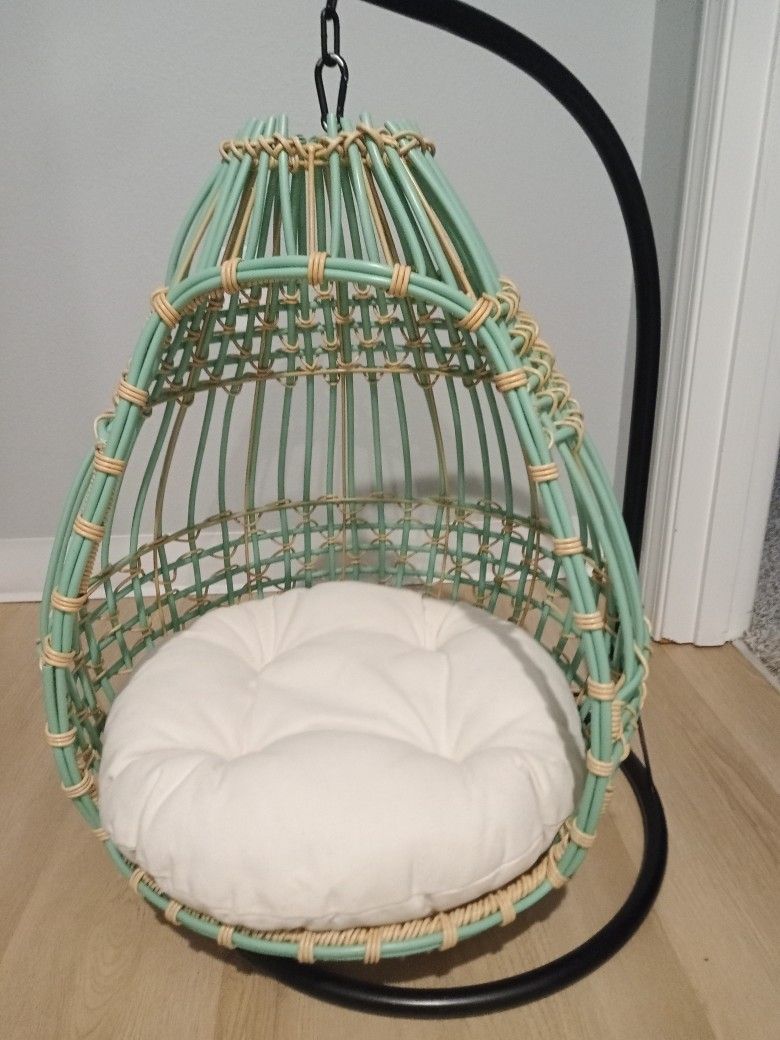 Gently used, clean, and comfortable cat swing to keep your cat or other furry family members in total bliss. Heavy duty metal pole and stand supports 30 lbs and rotates the bamboo enclosure °320 . The cushion is durable and easy to clean in the washer or just brush excess fur and wipe with a damp towel and air dry. A must have for anyone who wants to pamper their pet. I can ship if you pay the shipping cost up front :when I get to the post office you can pay the postage and provide the address and they will print a shipping label to go on the box.