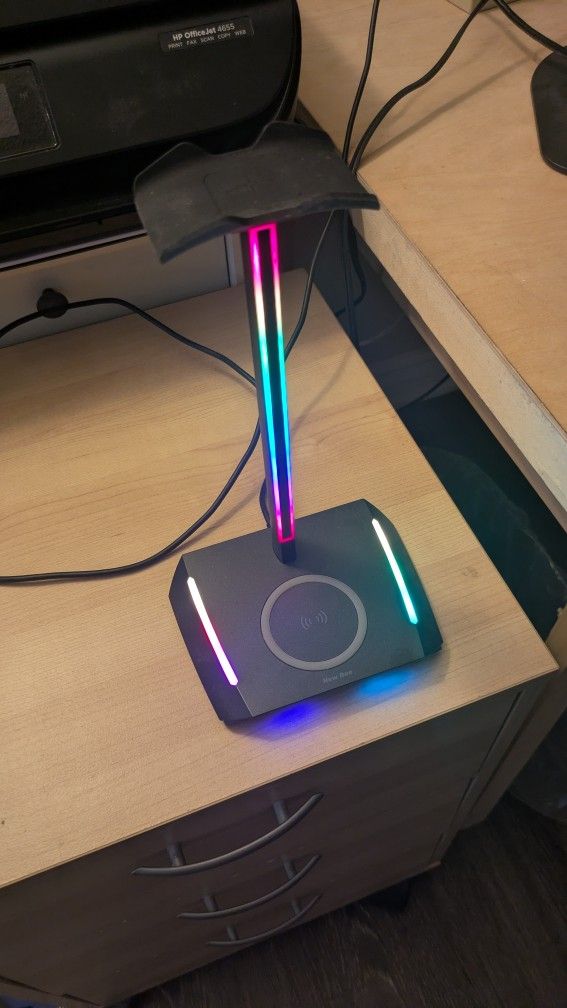 Hanger for gaming headset for sale. Has a wireless charger for phones. Backside has two USB-C slots and one general USB slot. Backside also has a button that cycles through different colors. This stand is powered via USB plug.