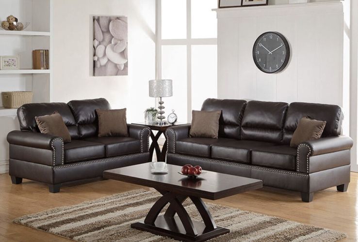 Enjoy elegance with the comfort of this 2-piece sofa set that features plush pillow double barrel styled back and seat rest trimmed in nickel finished buttons. Available in bonded leather in black and espresso. Sofa & Love Seat Color: Espresso Materials: Bonded Leather Plywood + Solid pine + Plastic leg Foam, Fiber Battings Dimensions: Love Seat 57″ x 35″ x 37″ H Sofa 78″ x 35″ x 37″ H Some Assembly Required