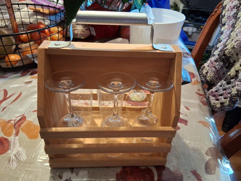 Beer caddy (6pk) with bottle opener. Fits wine glasses (some included).
