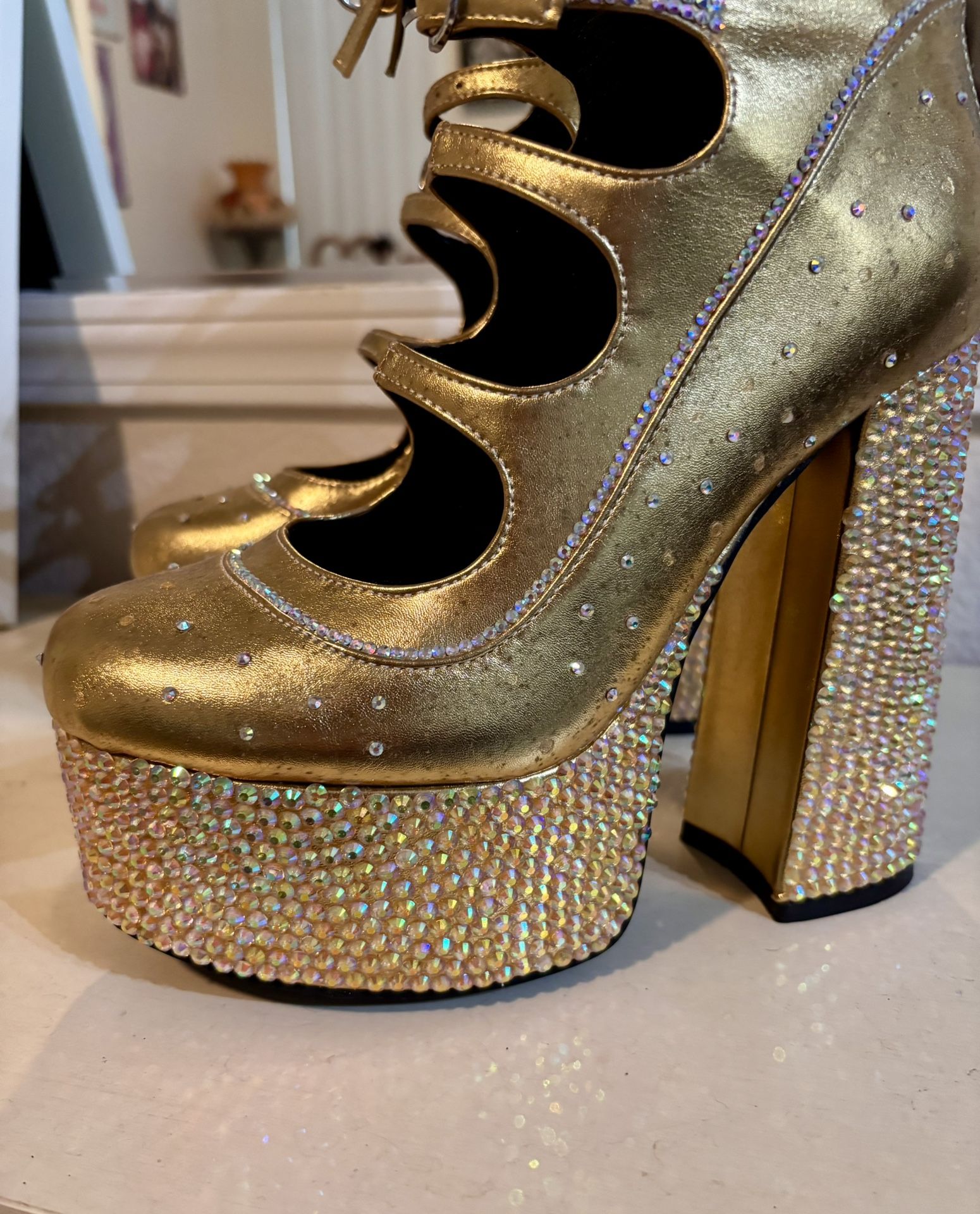 These Beautiful Gold Platform Heels are decorated with sparkly jewels! Perfect for New Years Eve Outfit, or for a special event! Even for a costume outfit. They have good traction on the bottom for no slipping, and great cushion inside for a more comfortable wear. I’m asking 25.00 Cash Only.