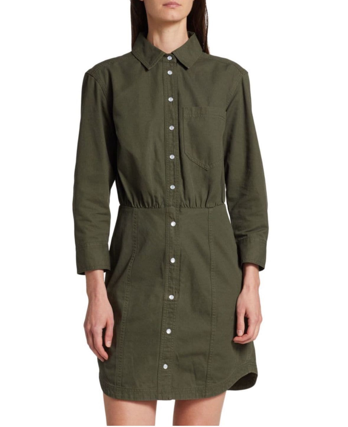 Looking for that one dress that feels structured but still easy to wear? The Keston Dress by Veronica Beard blends utility-inspired details with a flattering, feminine shape. Made from soft, durable cotton twill in a rich army green, it’s the kind of piece you can throw on and instantly feel put together. Features a sharp collar, silver snap buttons, chest pocket, and a cinched waist that subtly defines your figure without feeling too fitted. It’s perfect for casual days, running errands, or dressing up with boots and a jacket for a more elevated vibe.