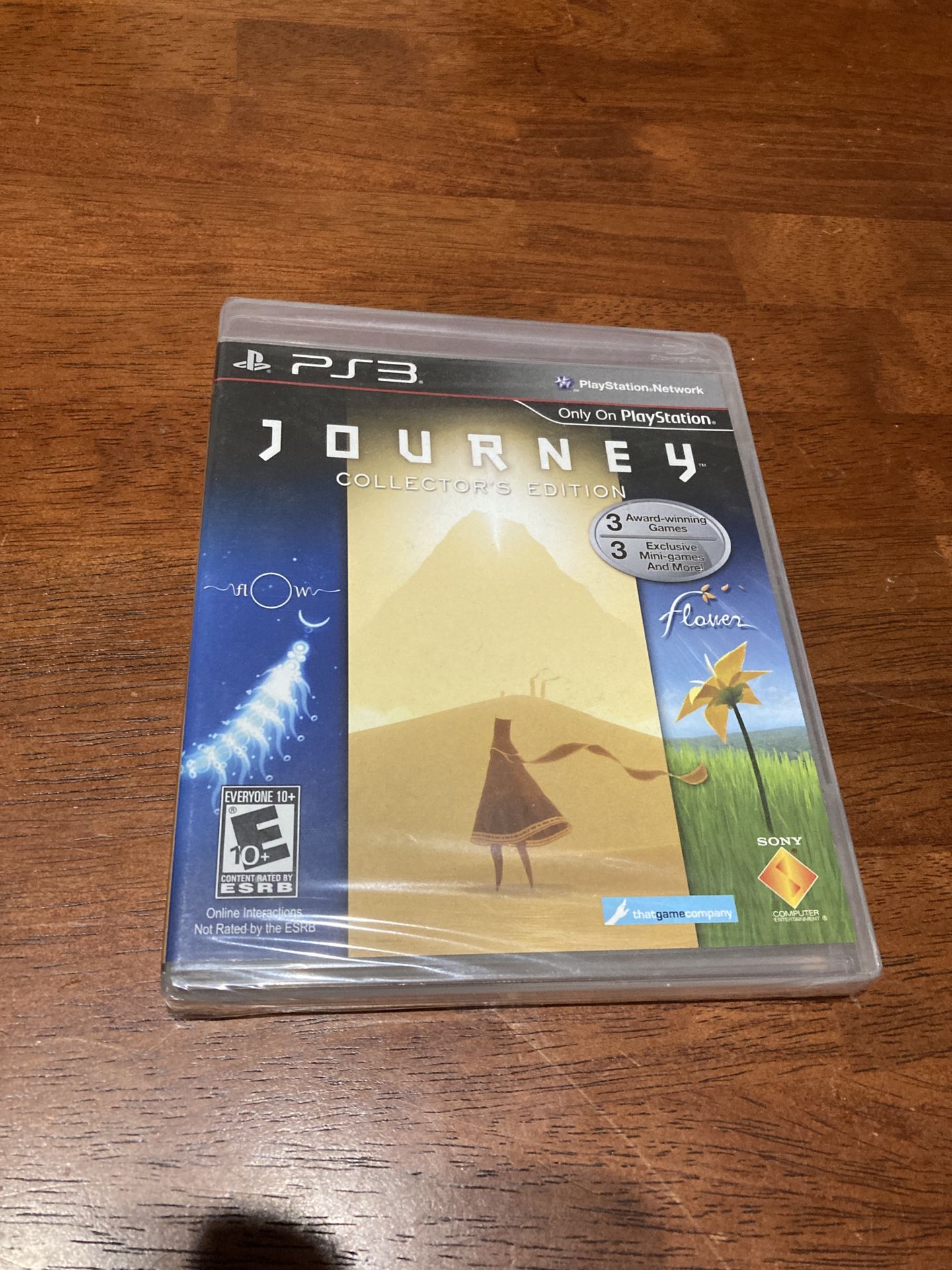 PS3 Journey Collector's Edition Brand new still sealed in plastic wrapping. Small rip in plastic at bottom as shown in last picture.