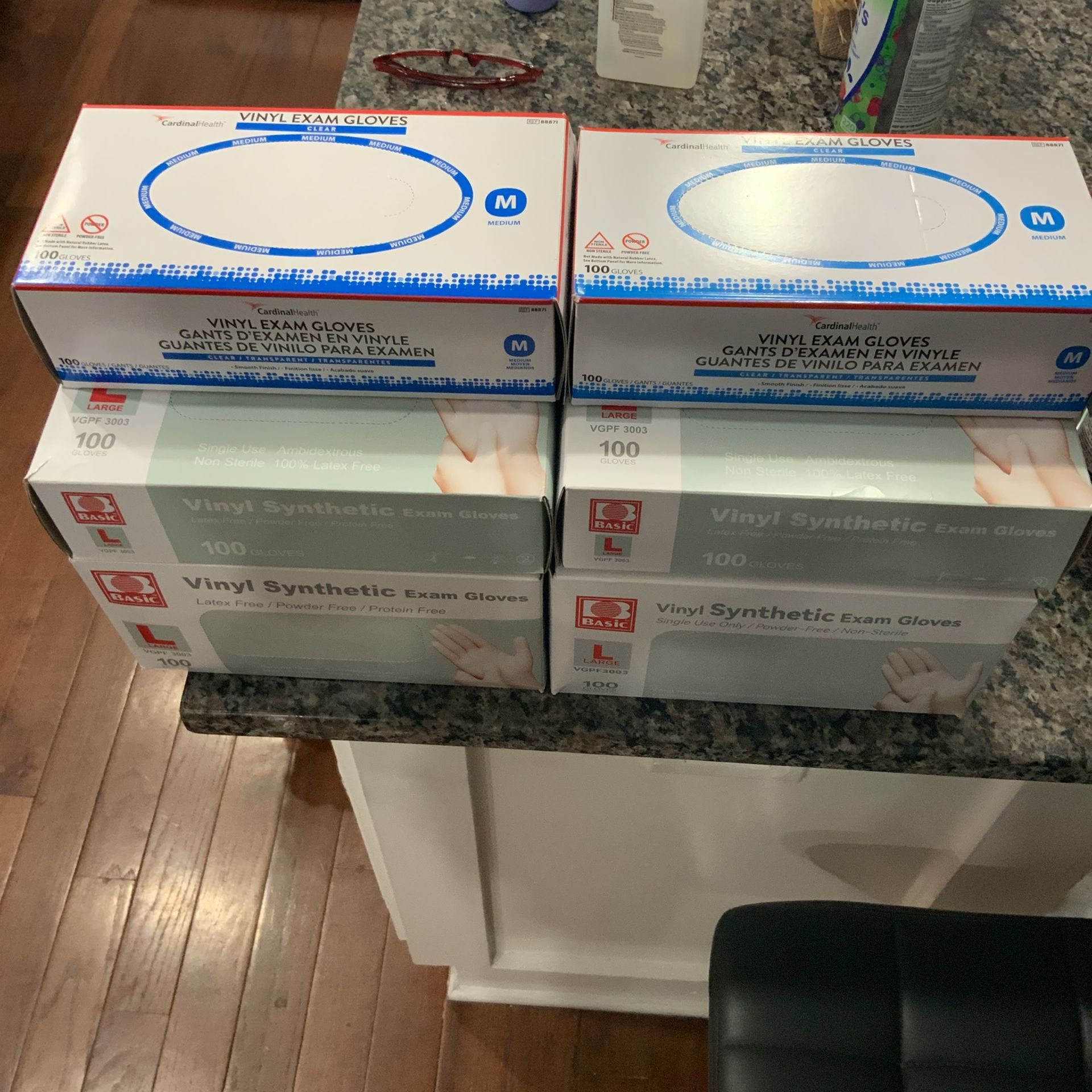 Vinyl Synthetic gloves. Latex free Powder free and Protein free. 13 boxes for $40.00 dollars. 10 boxes large. (100 gloves per box) 3 boxes medium. (100 gloves per box)