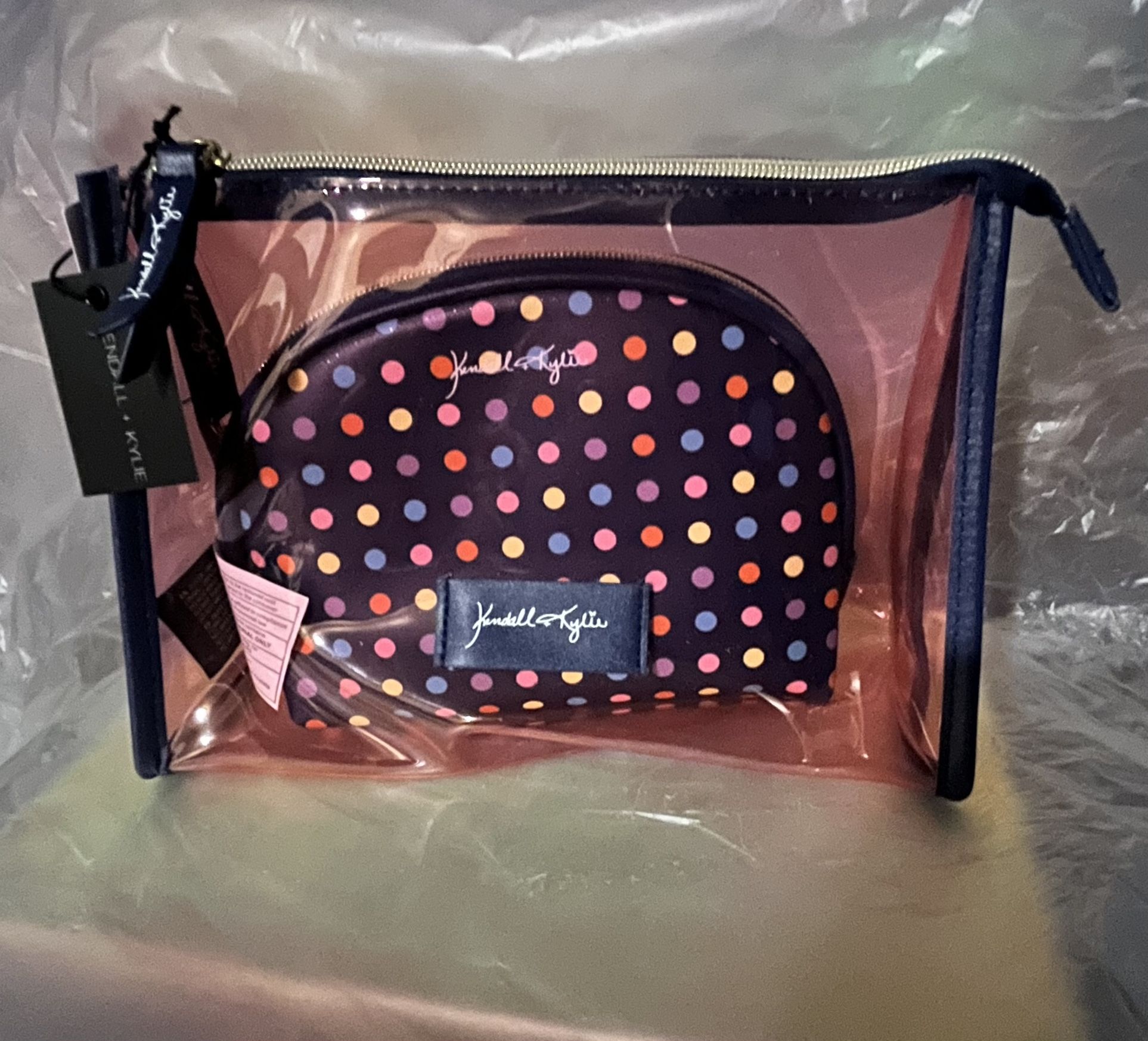 New! Tags attached! Stunning 2pc Kendall & Kylie Cosmetic / MakeUp Bag Set in Transparent & Multicolor Poke Dot Print. 100% Polyvinyl Chloride Material. Durable, Waterproof and easy to clean. Set includes larger Transparent Rose Red Bag with black PU Leather trimming and featuring golden high quality Zipper closure. 10” x 7” inches. Inside is another smaller cosmetic bag to match the trimming of the first one, in black with multicolored poke dots design, also featuring golden zipper closure. 7” x 6” inches. This is the perfect pair! Both bags feature Kendall & Kylie stitched tags on each zipper, as well as authentication tag inside. Perfect for travel, as carryon bag or to keep with you on the go to keep your favorite essentials close and handy. These also make great gifts for any occasion. Also available in different color options such as translucent holographic rose gold , clear/black leopard and clear/pink leopard prints (see my other listings).