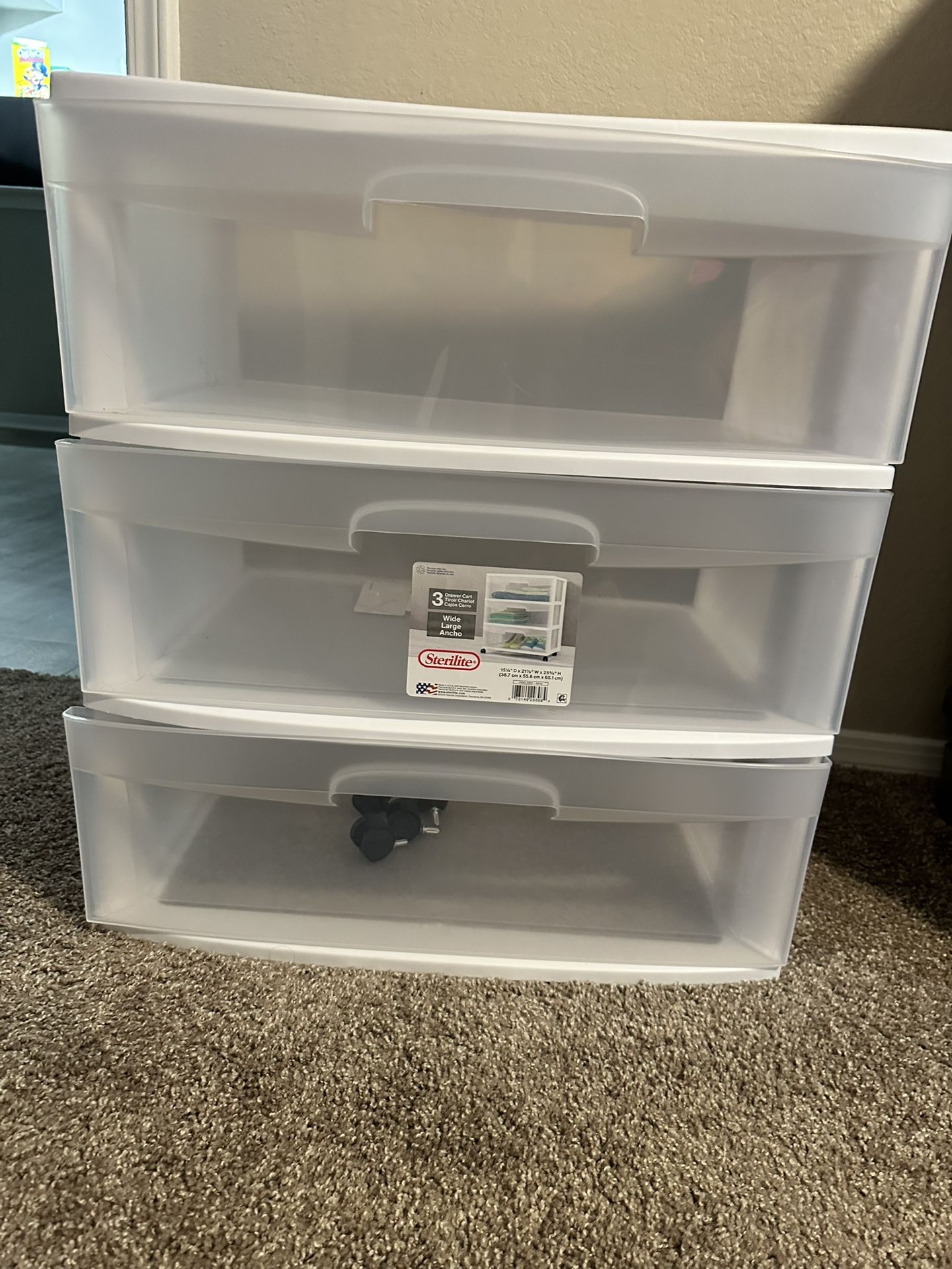 Three drawer cart with wheels.