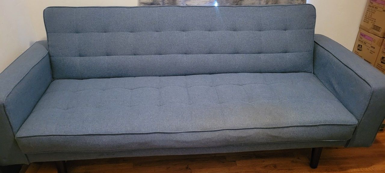 Blue futon, good condition. 6 feet 12-15 inch. Long. 3 feet 8-9 inch. Wide as bed. $100 OBO.