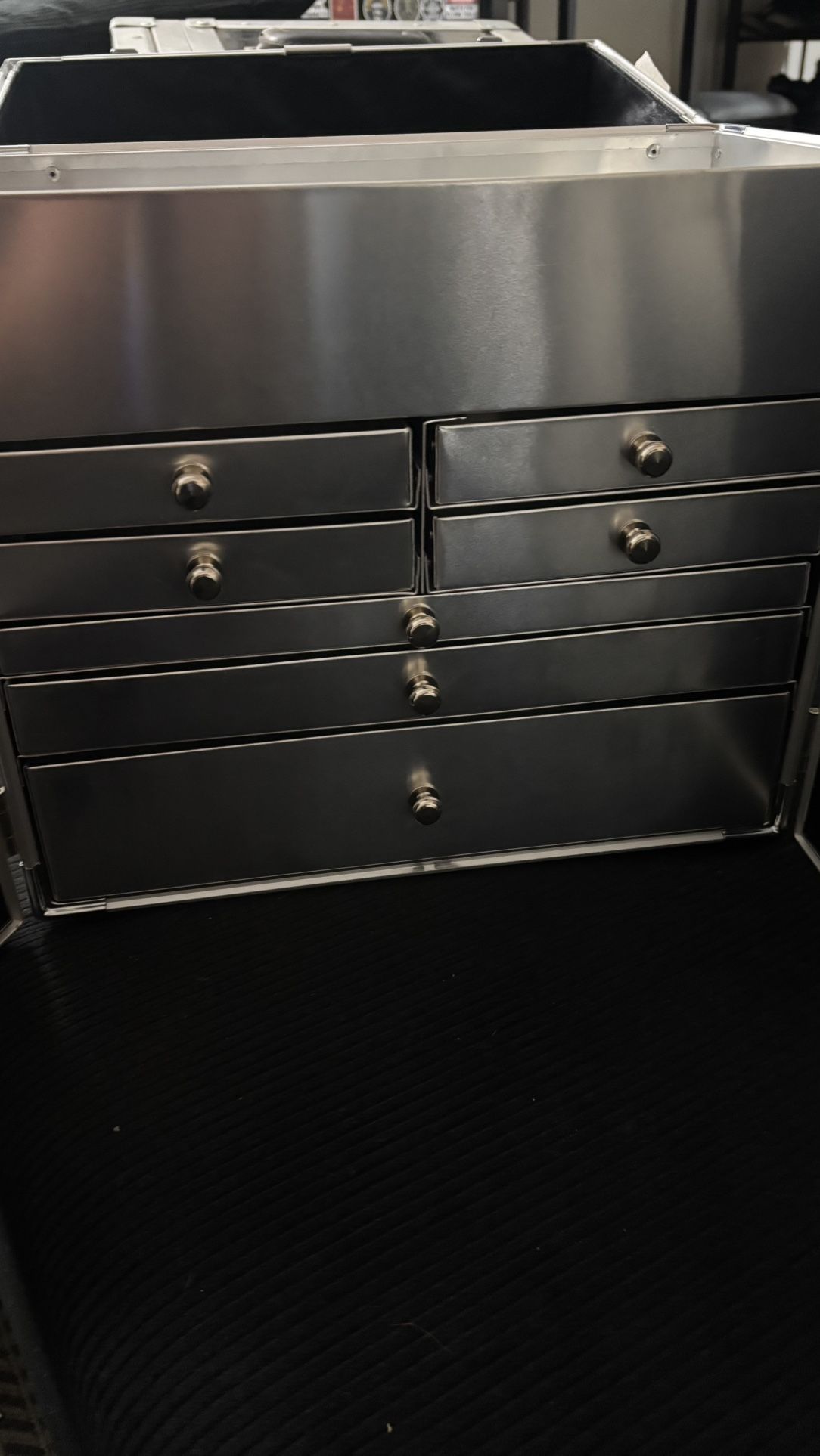 Made by Japanosque a very heavy duty and durable make up travel box To a of space and comes with lock and key . Very sturdy and secure box