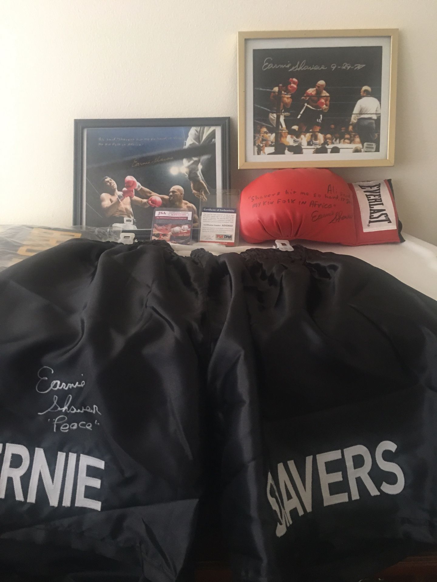 Earnie shavers boxing trunks boxing glove two pictures all signed on the glove and the picture Ali said that Earnie Shavers Hit me so Hard that My kinfolk Felt it in Africa