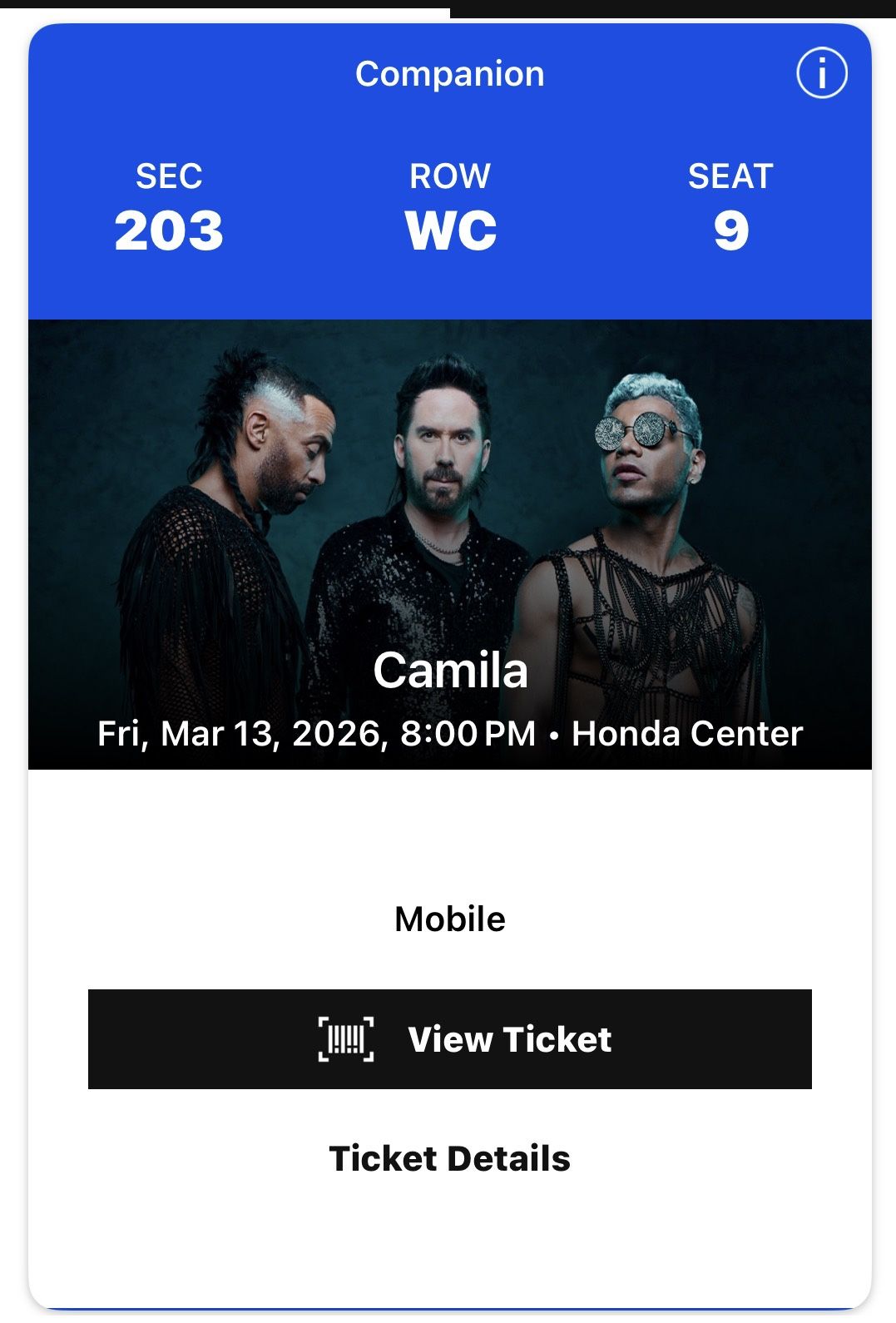 Two tickets half price for Camila. One wheel chair and companion ticket. $100 for both. $50 each.