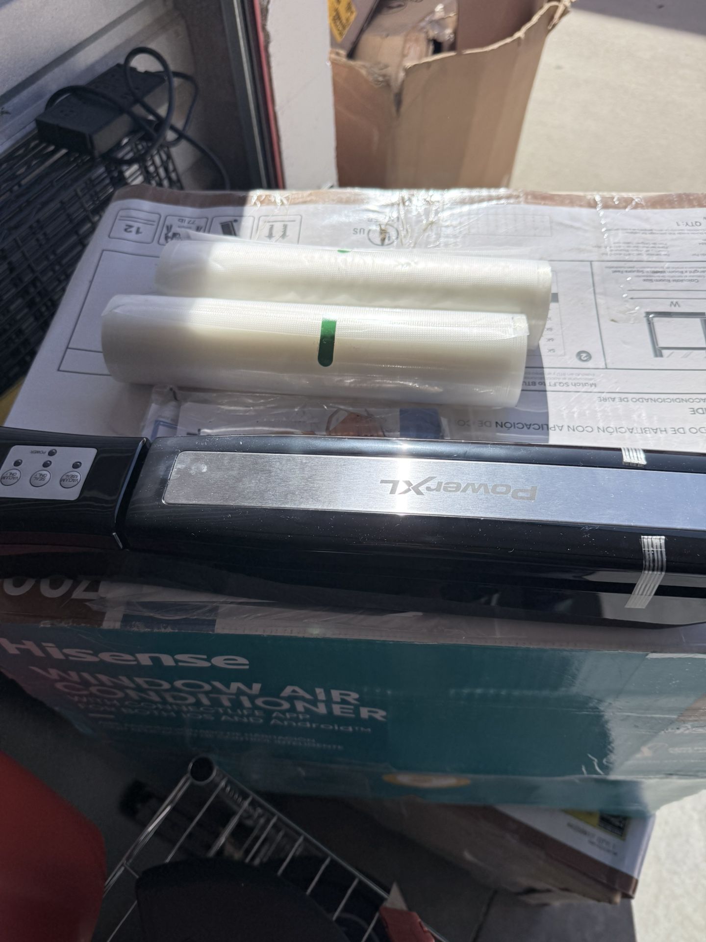 PowerXL vacuum sealer machine new and never used—only taken out of the box. Great for sealing meat, veggies, freezer meals, and meal prep to keep food fresh longer and prevent freezer burn. Simple button controls and strong airtight seal. Includes 2 vacuum sealer bag rolls (pictured). Open box / unused.