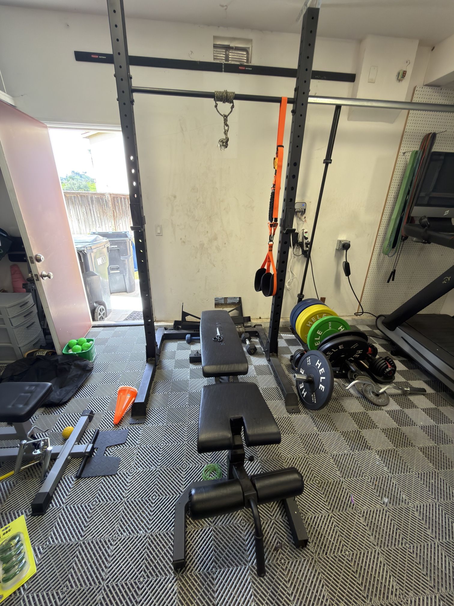 Selling as set Hele Fitness (Hawaii Brand) Everything included: Hele Barbell (45 lb) Power Squat Rack with Pull-Up Bar, Spot Arms and One Pair of J-Hooks. Bumper Plates 260lb Color (10,15,25,35, & 45) Adjustable Bench Hele Collars Floor plate and barbell storage