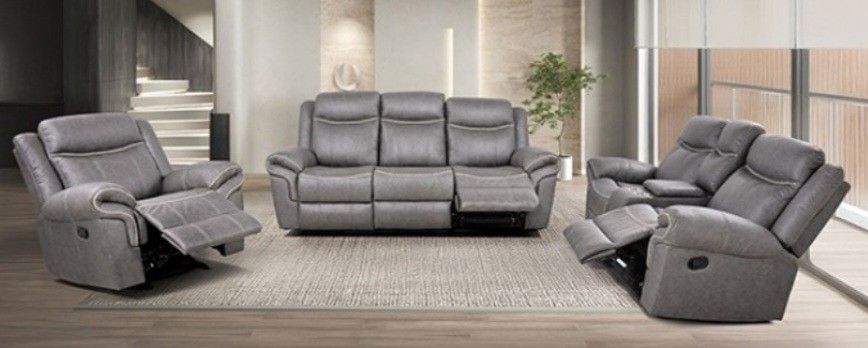 Brand New Grey Leather 3pc Reclining Sofa Set