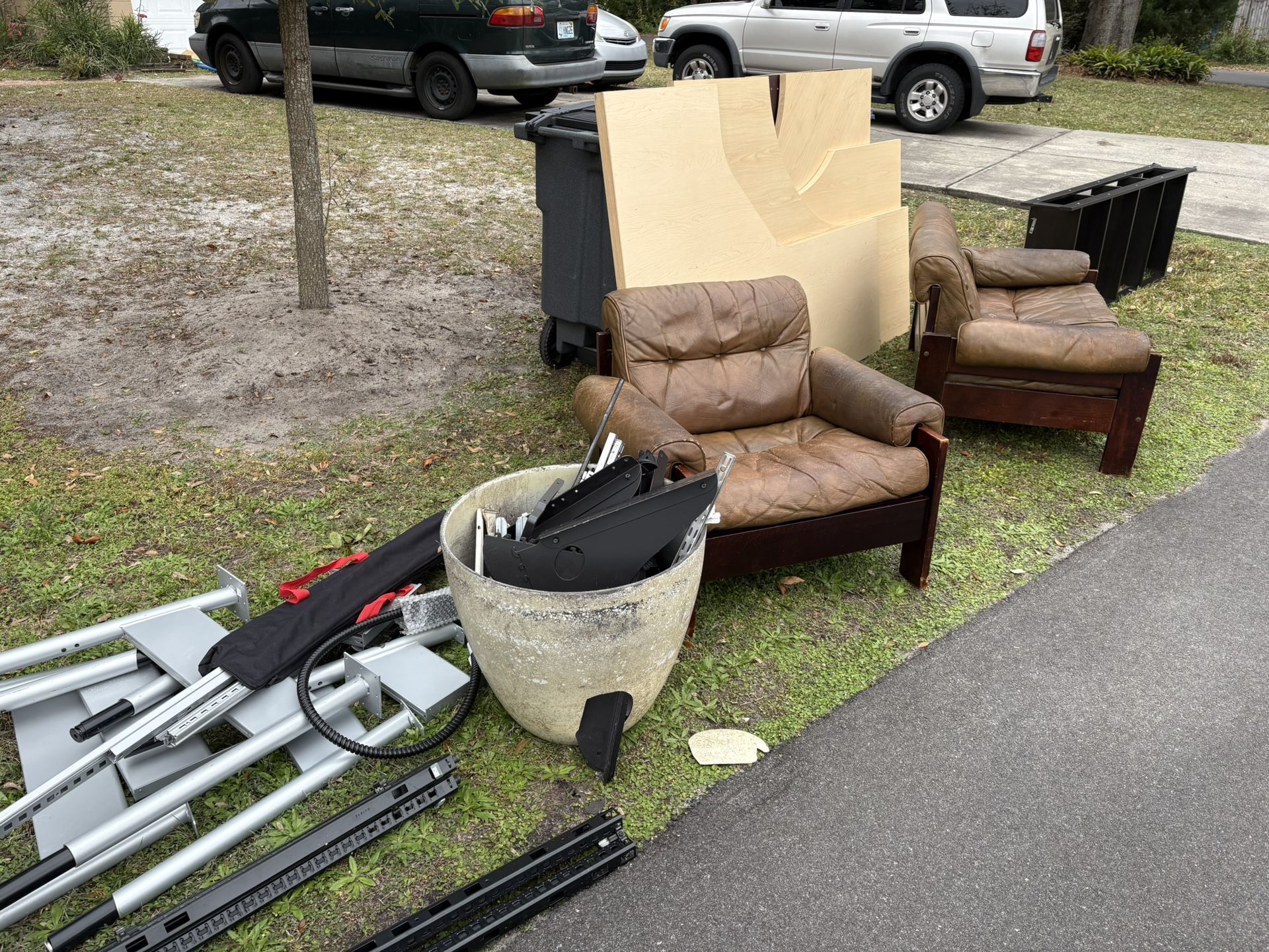 Commercial grade Haworth desktops and hardware, used but in great shape and indestructible. Vintage matching leather and solid wood couch and chair, Arne Norell style. I’ll try to update the post as things disappear.