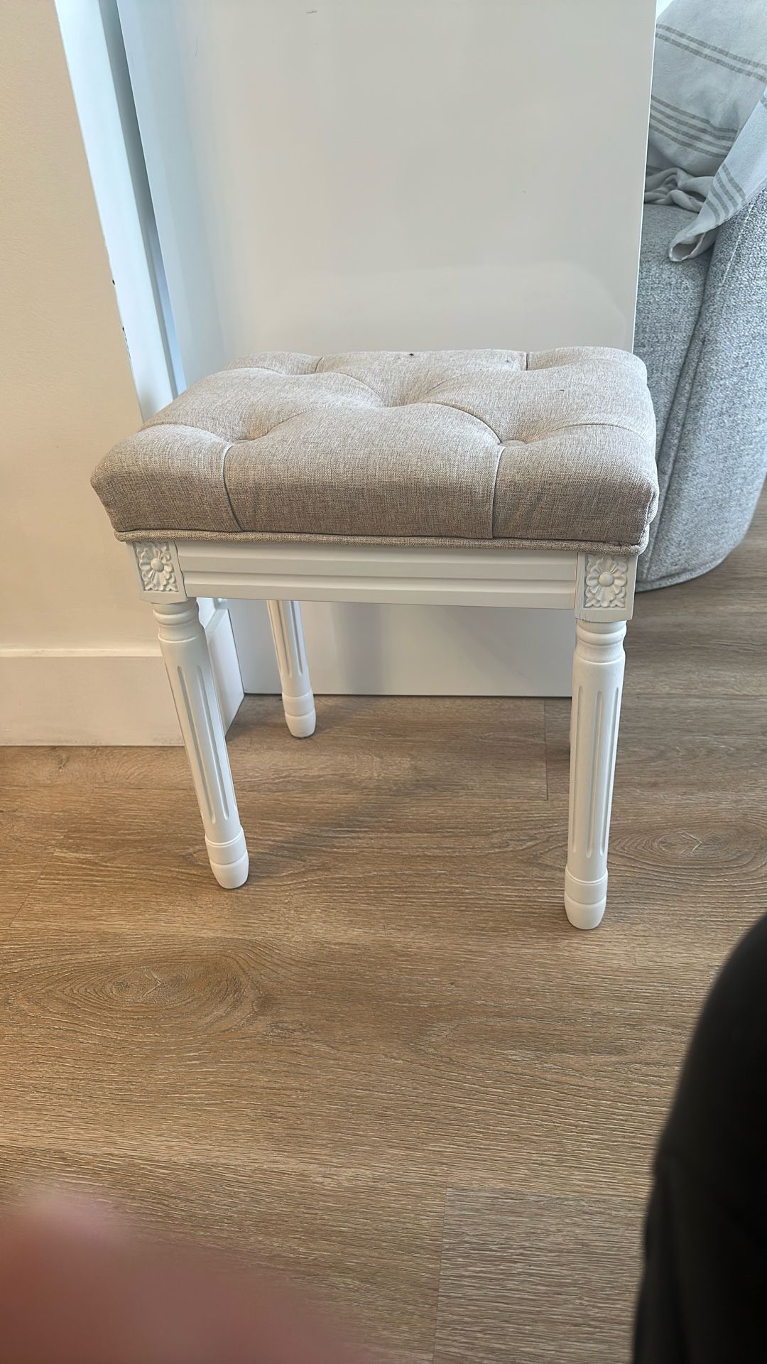 Elegant White Upholstered Vanity Stool – Excellent Condition Add a touch of classic charm to your home with this elegant white vanity stool. The design features beautifully carved wooden legs and a soft, tufted beige cushion that provides both comfort and style. Perfect for a bedroom, makeup vanity, or entryway accent. Details: • Color: White base with beige fabric seat • Material: Solid wood frame with upholstered cushion • Style: Vintage-inspired / French country • Condition: Gently used, excellent condition – no stains or damage This stool is lightweight, sturdy, and versatile — ideal for makeup tables, piano benches, or decorative seating. 💰 Price: 55 dollars