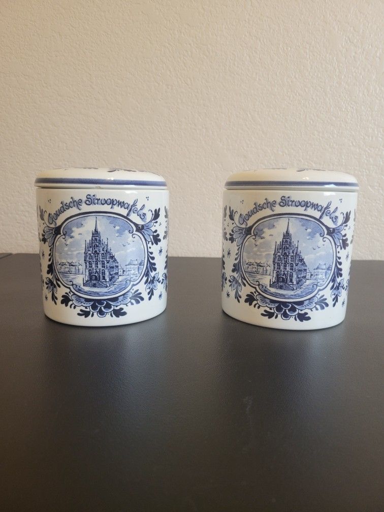 Set of 2 Vintage Delft Blue Goudsche Stroopwafels Hand-painted Ceramic Jars