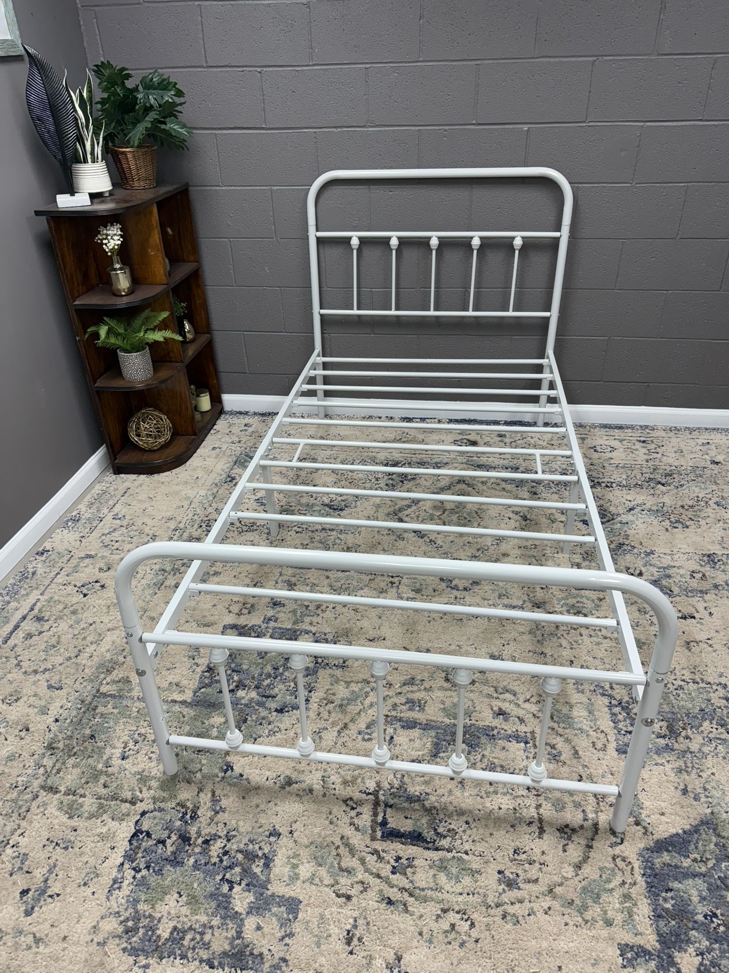 White Twin Metal Bed Frame. It is in excellent condition. Message me if interested. Ask about delivery if needed. Check out my other listing for all of your furniture/ household needs