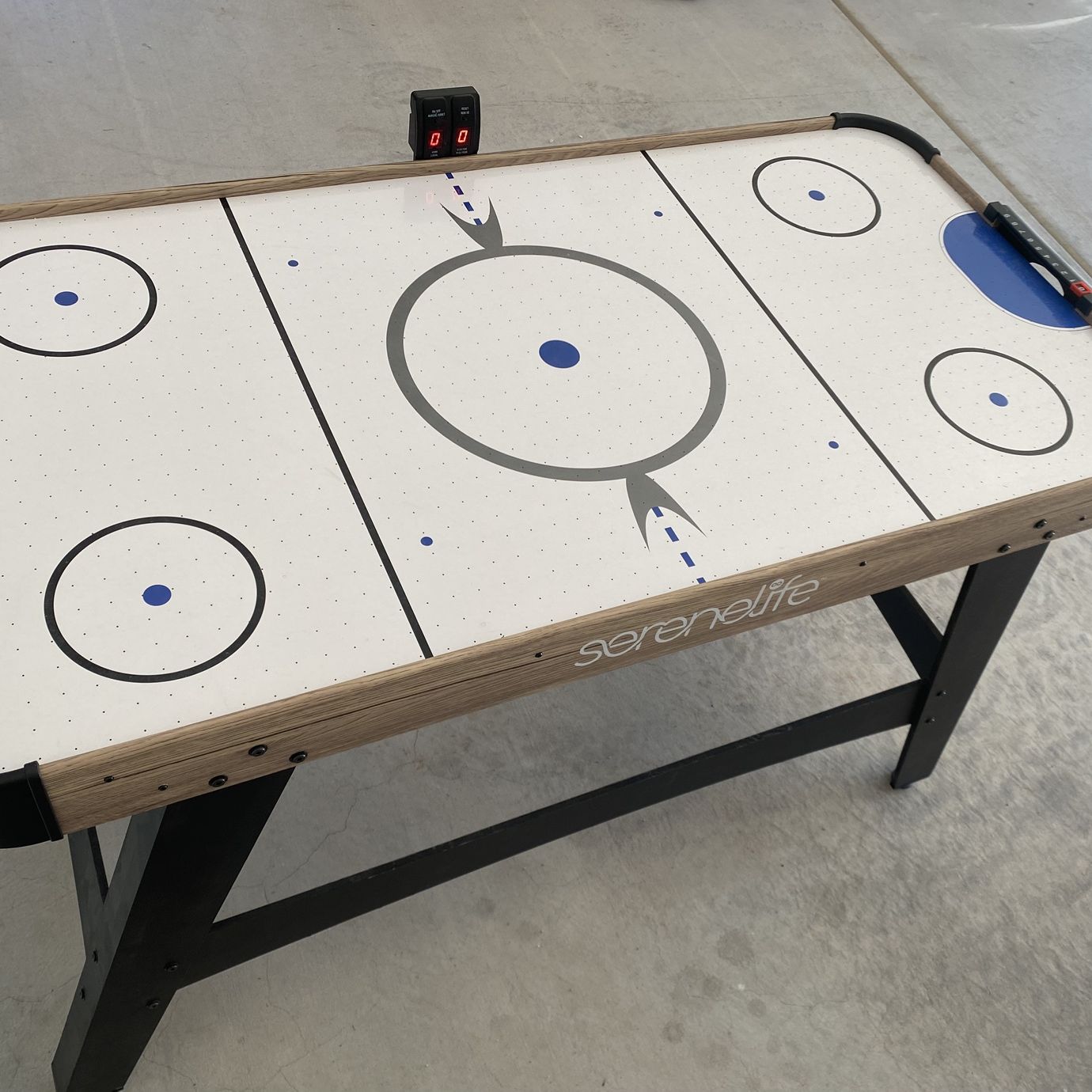SereneLife 58in Powered Air Hockey Table Upgraded 700mA 12v 2X Powerful Motor, 4 Player 2 Pucks 4 Pushers, Full-Size Arcade Style, Inline Power Switch and Battery Free Digital LED Score Board Great condition Works well Brand New it is $165 Just no place in our home any longer for this game table