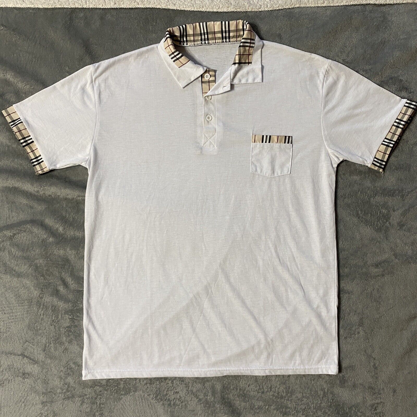 Mens Size XL White Short Sleeve Button Front Shirt Plaid Trim Front Pocket