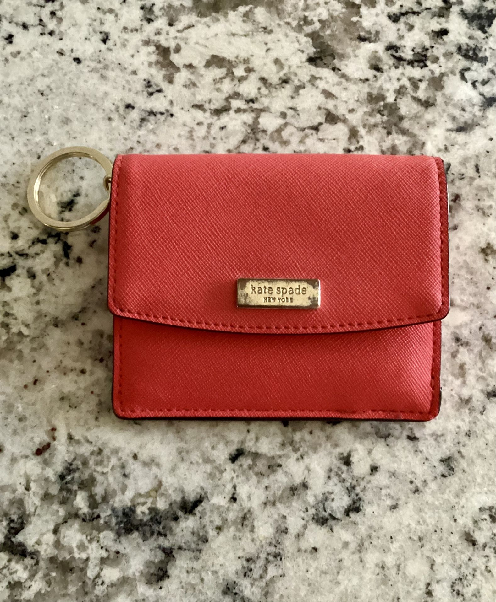 Kate Spade Red Saffiano Leather Keyring Coin Purse Wallet Kate Spade Saffiano leather small coin purse/wallet. Fearures: keyring, multiple card slots, clear ID window, and a zippered pocket. The logo on front is slightly tarnished. $10, cash only Smoke-free home