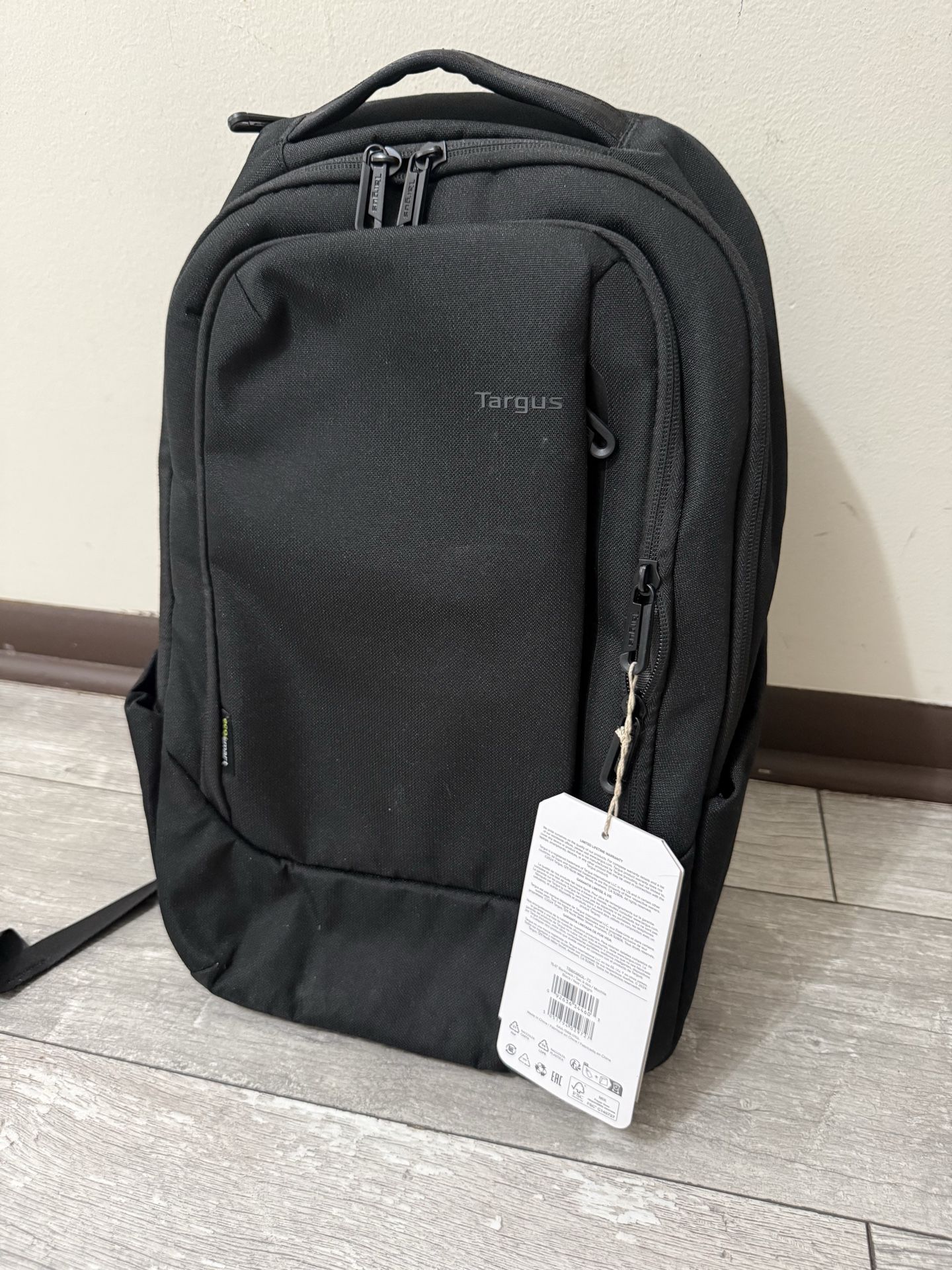 This is a Targus 15.6" Cypress Hero Backpack. It's black and made with EcoSmart materials. It features padded shoulder straps and multiple compartments for organization.