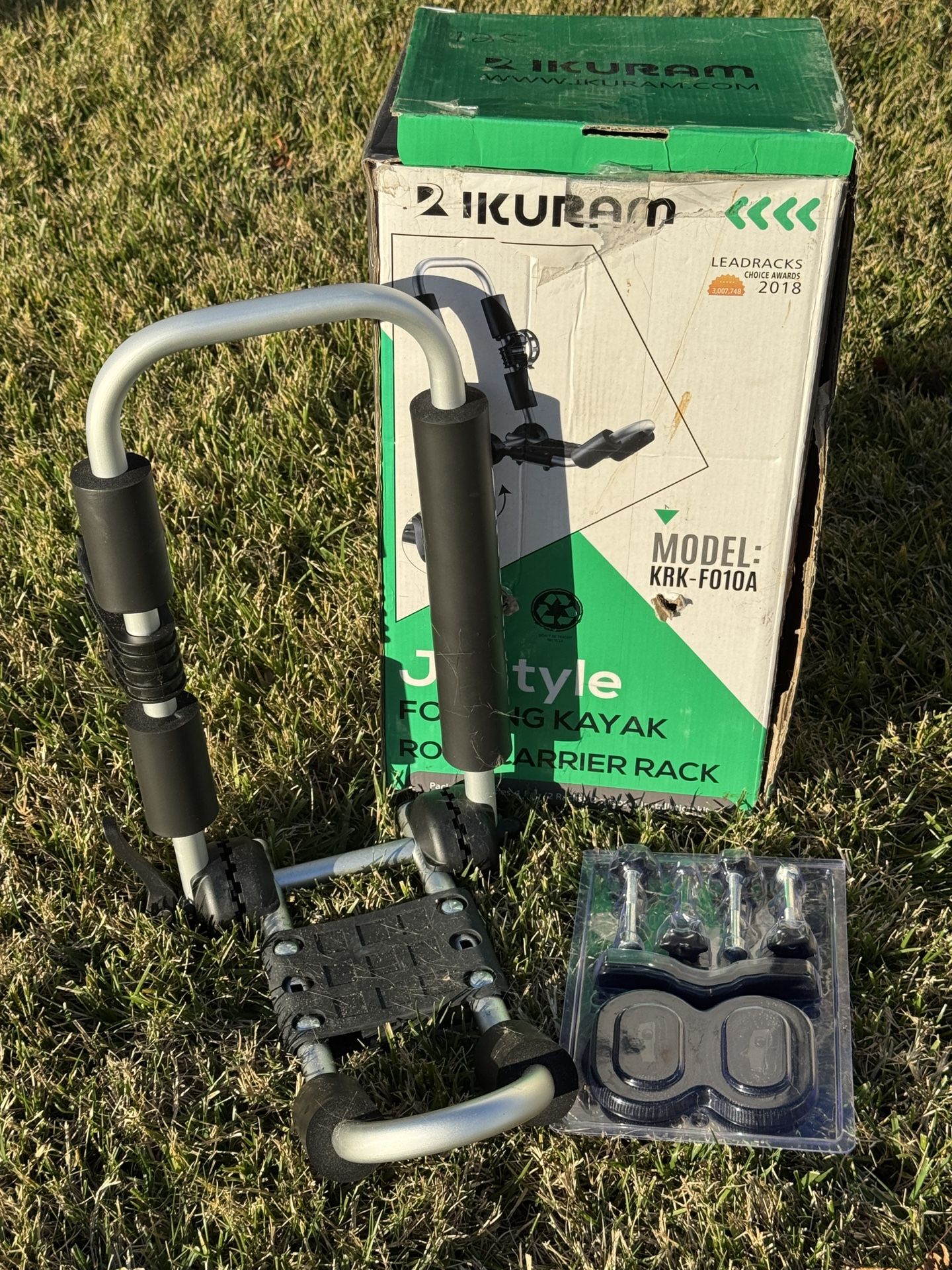 Brand new with or without mangled box. Assembly attempted by 19 year old son to use for surfboard Frustration ensues, pieces possibly (probably?) lost - try the hardware store.
