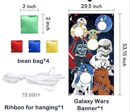 Bean Bag Toss Game with 4 Bean Bags, 1 Backdrop and 1 ribbon to hang the backdrop Banner is 29.5inch*53.15inch Bean bags - 2inch*2inch. White ribbon is approx. 19.68ft which is long enough to hang the toss game banner