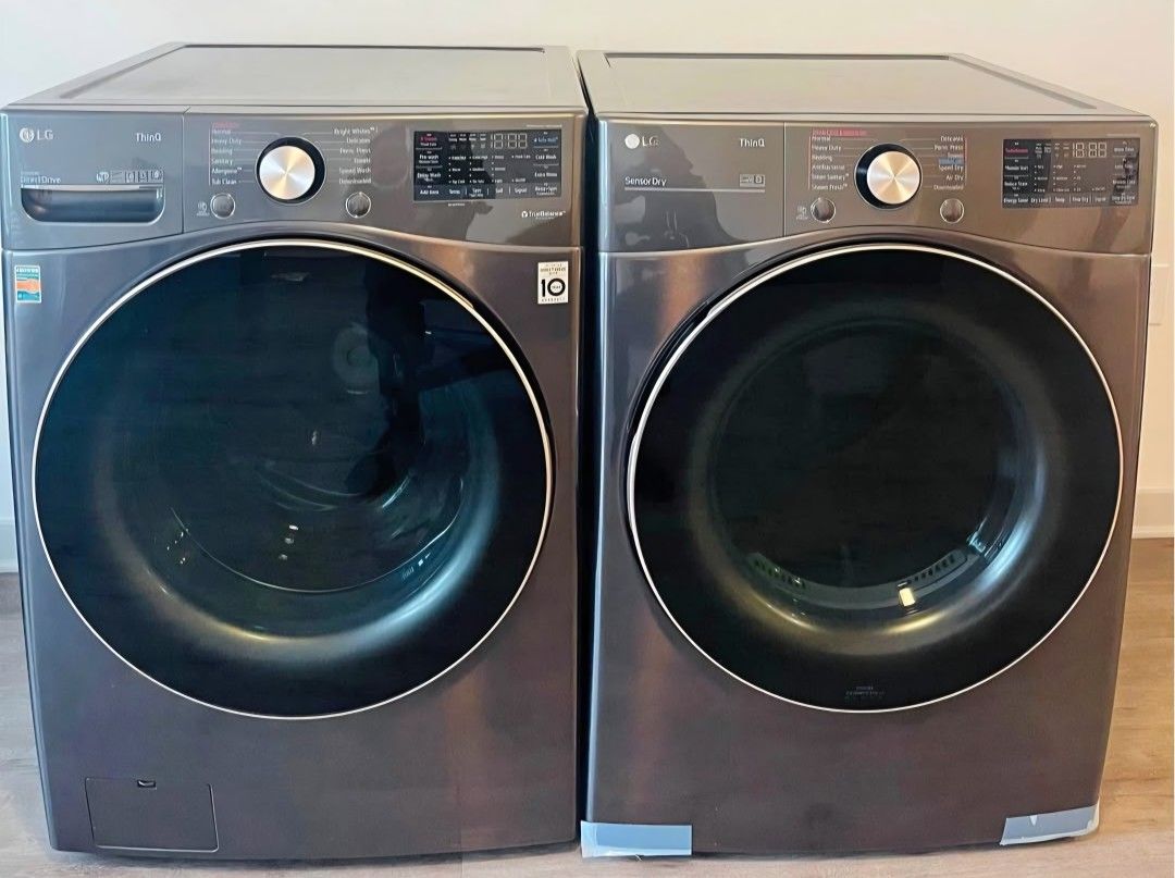 Brand New LG ThinQ Smart Washer and Dryer set.. LG ThinQ Washer has a huge 5.0 cu ft tub with Wifi,Remote start, and Turbowash Technology.. LG ThinQ Dryer has a large 7.5 cu ft drum with Wifi, Remote start and Turbosteam Technology.. 1 year warranty. We deliver