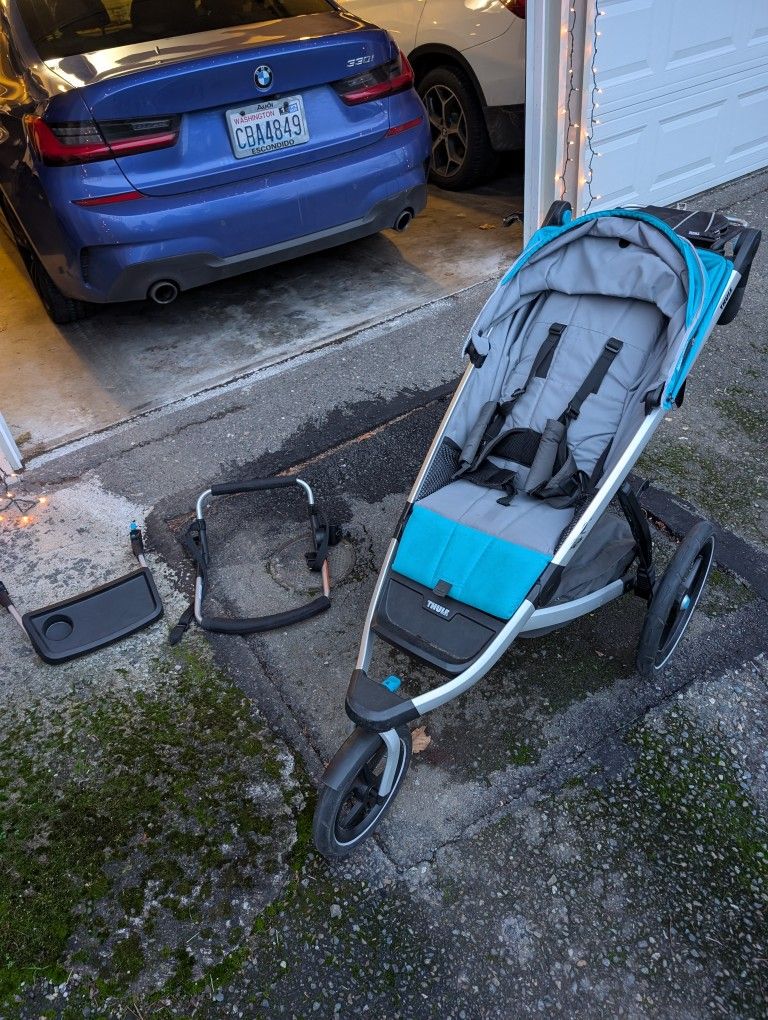 Thule Urban Glide 2 with several accessories. -cup and tray attachment -Bassinet attachment -rear phone and water attachment Garage kept and in great shape. New tire tubes just installed since it's been sitting in the garage unused for close to a year.