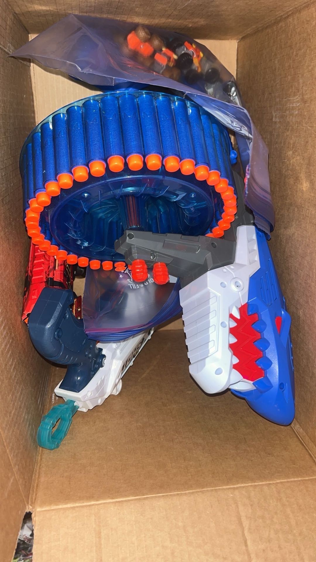 About 3 nerf guns 1 REALLY big one. Son no longer wants nor plays with them and wants to make some money. Comes with many bullets !