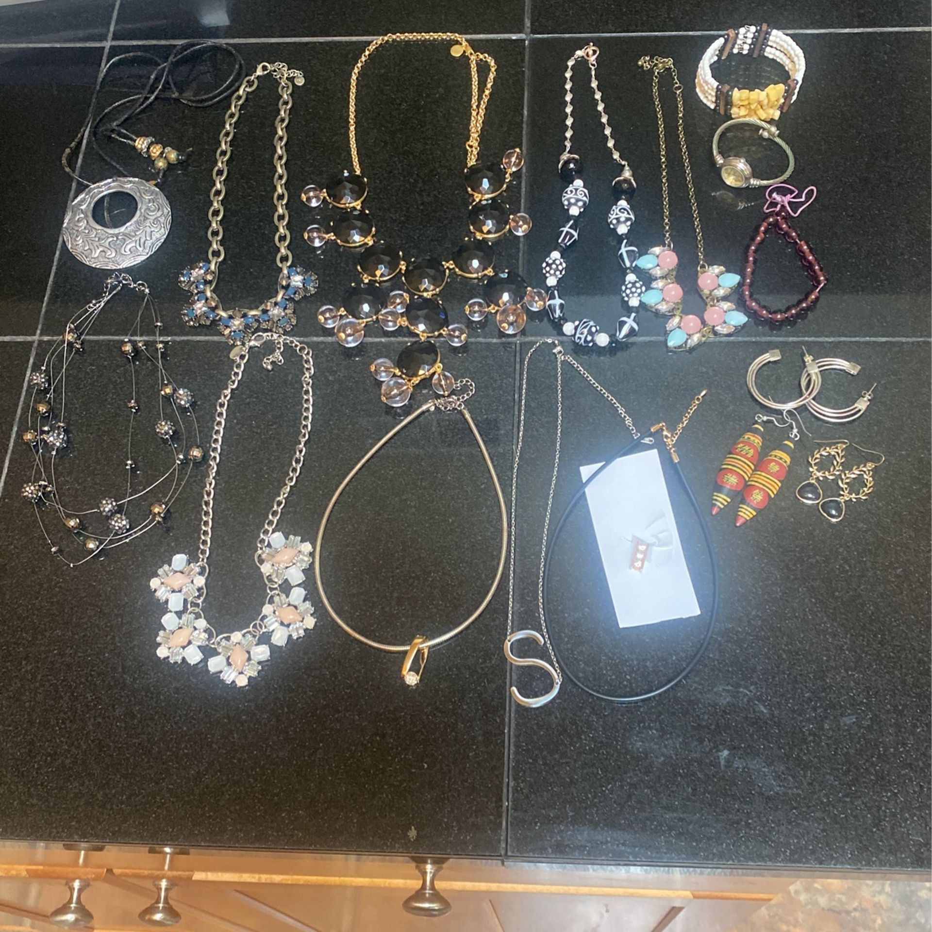 Used costume jewelry that includes the following : Large silver pendent on long leather cord Blue and gray stone necklace Large black and white with gold chain necklace Black and white beaded necklace Light blue and pink and clear stone necklace White, black, brown and beige cuff bracelet Silver da vanci quartz cuff watch Purple bead bracelet Silver earrings Pendent earrings black brown yellow Black with gold pendent earrings Black mirrored balls and multi stones Balls layered necklace Pink white and silver stone with silver chain necklace Good pendent necklace “S” silver necklace Black rubber necklace Gold with diamond like pendent Whole lot for $35