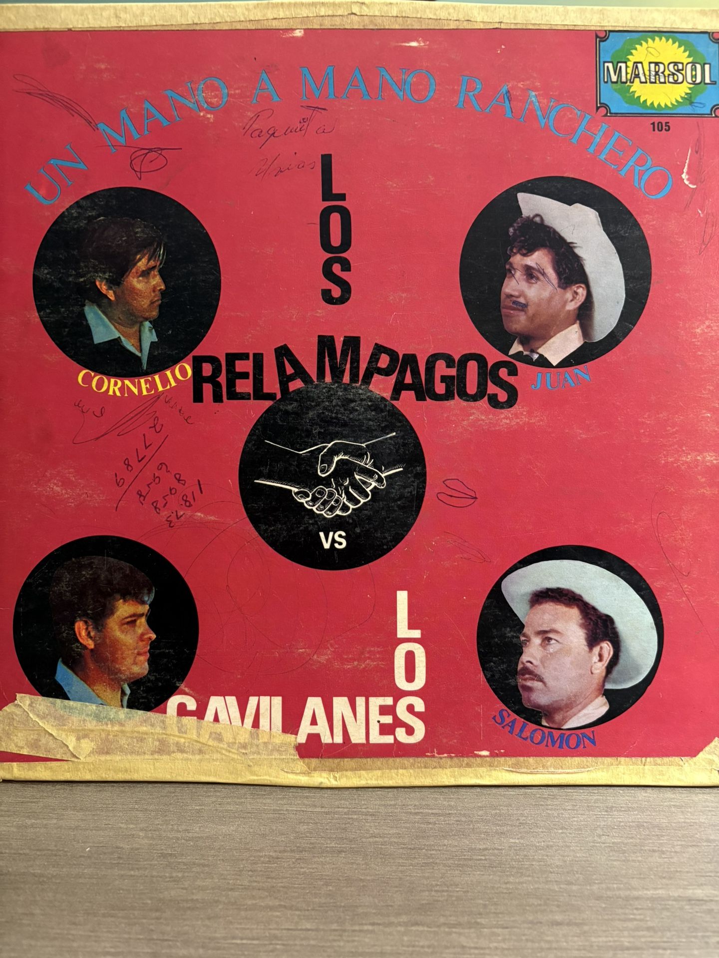 This vinyl record is titled Un Mano a Mano Ranchero, featuring a musical showdown between the Norteño groups Los Relámpagos del Norte and Los Tremendos Gavilanes. The cover features photos of the lead members, including Cornelio Reyna of Los Relámpagos and Juan Salazar Salomón of Los Gavilanes. The album was released on the Marsol record label. Ready for sale pick up inn Buena Park Ca.