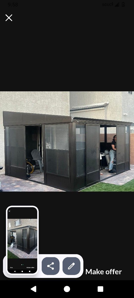 Located Rainbow & Alta Enclosed Patio Sunrun Sells on Amazon For $4000 +shipping Already disassembled and complete Can be bolted down to any house and cement slab Weather proof all windows and doors open and have bug screens Selling for $1400obo pickup Delivery and install$2000 Accept Cash , cash app and zelle