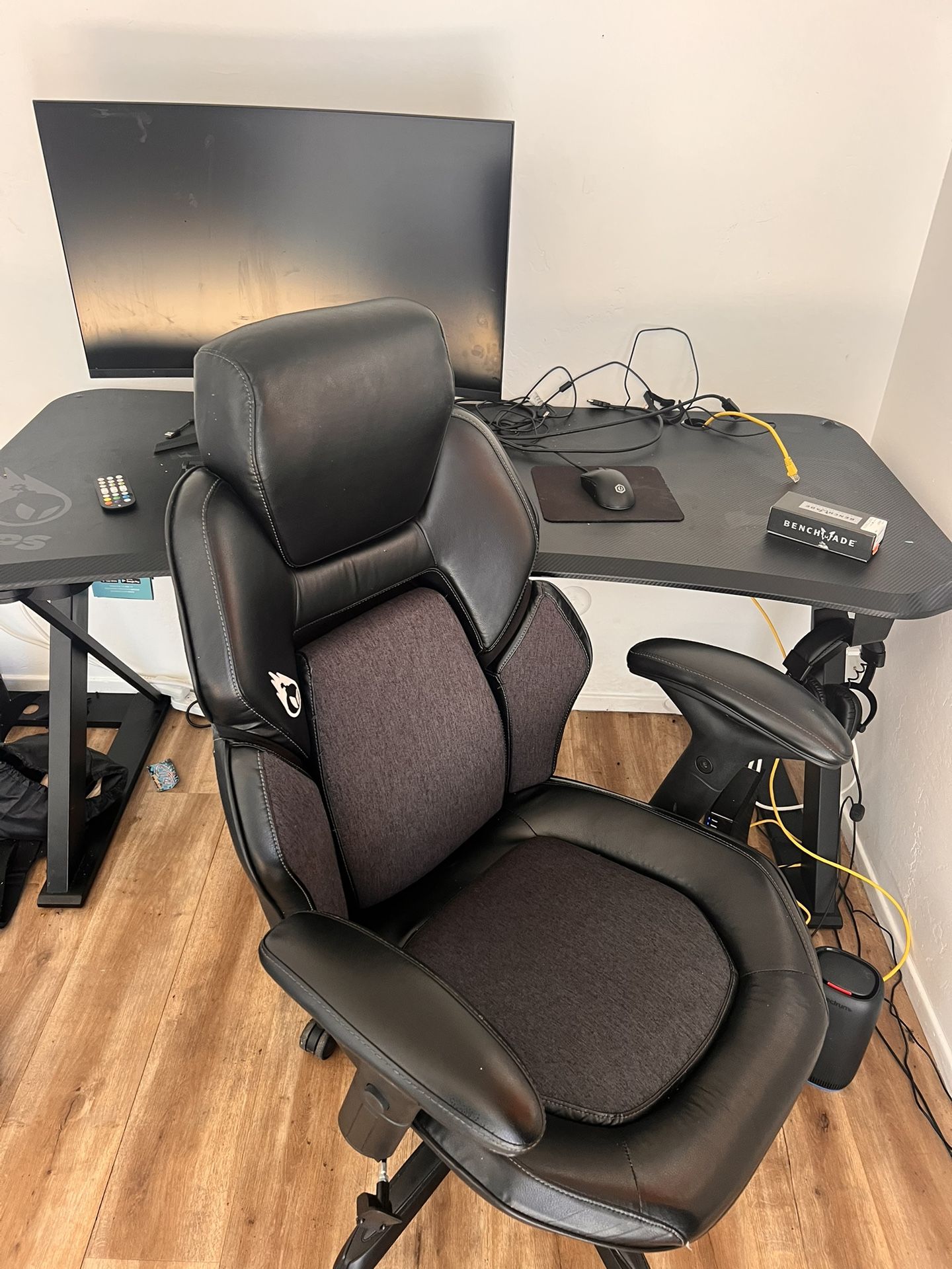 Everything works good the lights work too. Has the controller for the table. Monitor NOT included ONLY desk and gaming chair