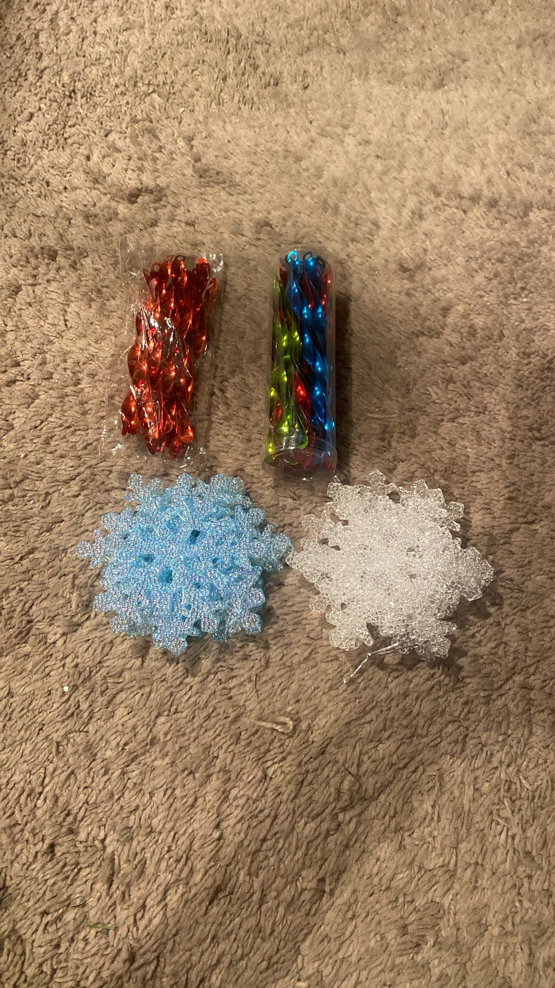 Christmas tree assorted ornaments, 14 snow flakes, 2 packages of acrylic Christmas icicles ornaments ( both packages never opened as shown)