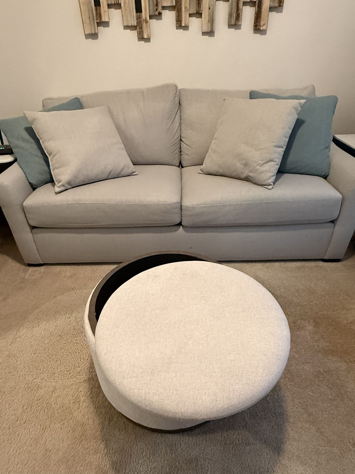 Comfortable neutral-colored couch that pulls out into a full-size bed. Perfect for guests, apartments, or multi-use spaces. Clean and well maintained. Pickup only.
