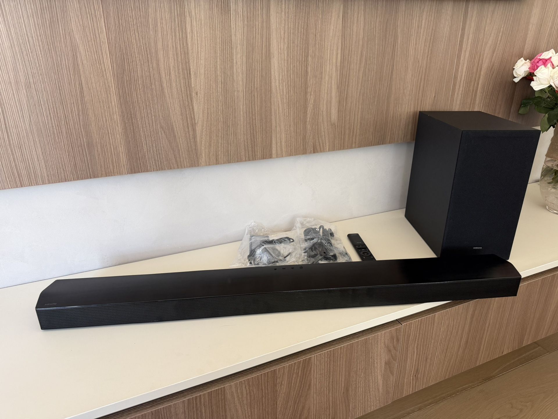 Pristine Samsung HW-B73CD soundbar and subwoofer combo. Comes with remote and all cables still in plastic. Sounds amazing for movies or music. Used like new